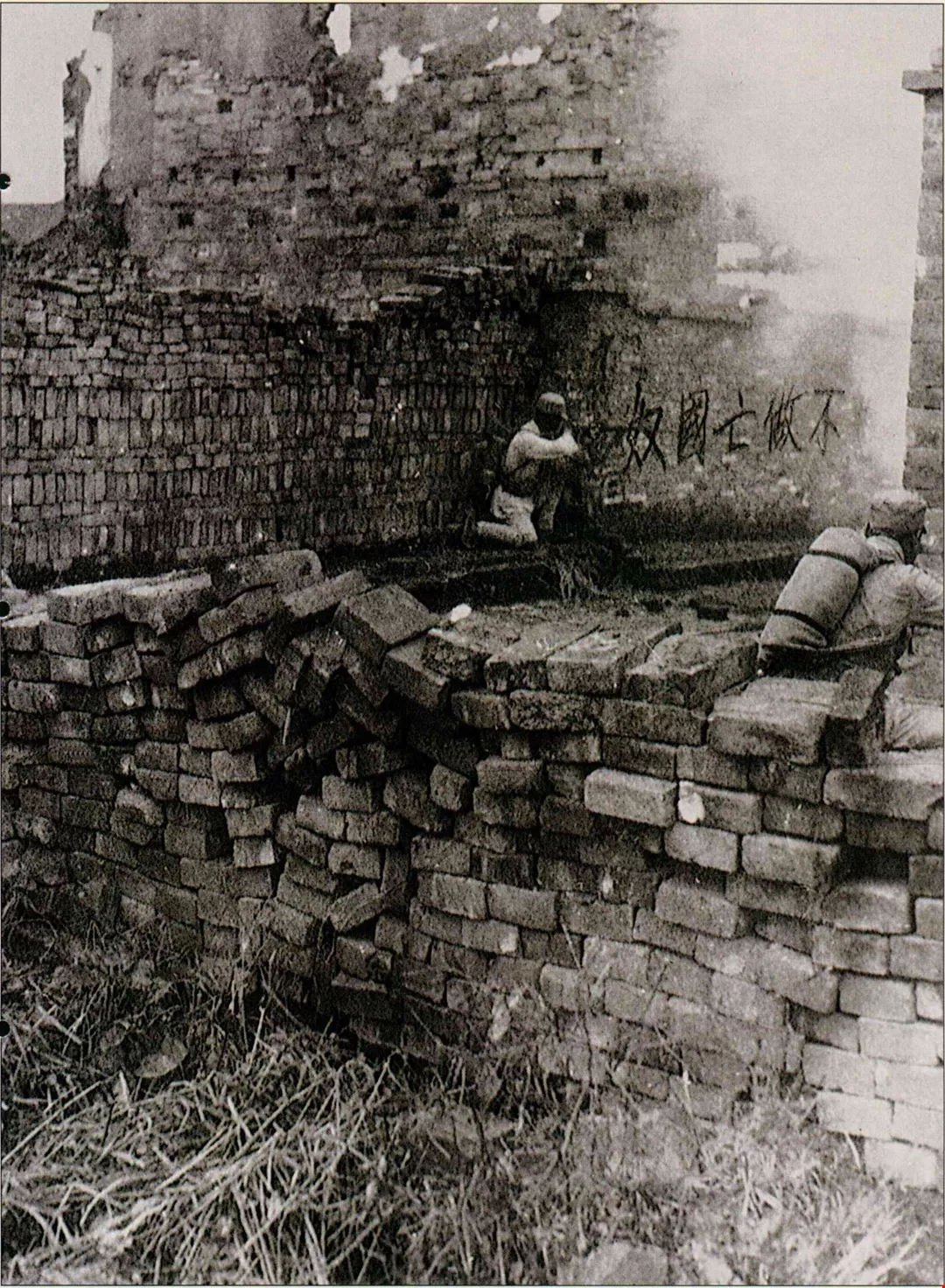 一九三九年十二月二十二日湘北大捷,國軍在通城巷戰的情景,牆上還有「不作亡國奴」字樣。(漢聲雜誌提供)