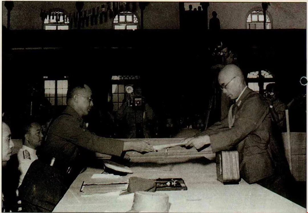 一九四五年,在華日軍參謀長小林淺三郎,向中國戰區最高統帥代表何應欽呈遞降書。(中國國民黨黨史會提供)