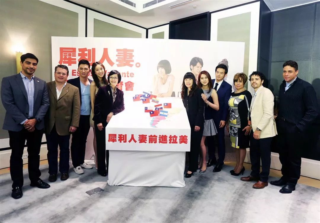 外交部次長史亞平(左5)與《犀利人妻》主要演員及我拉美友邦駐華使節們齊聚記者會現場,表達對外交部推廣台劇的支持。