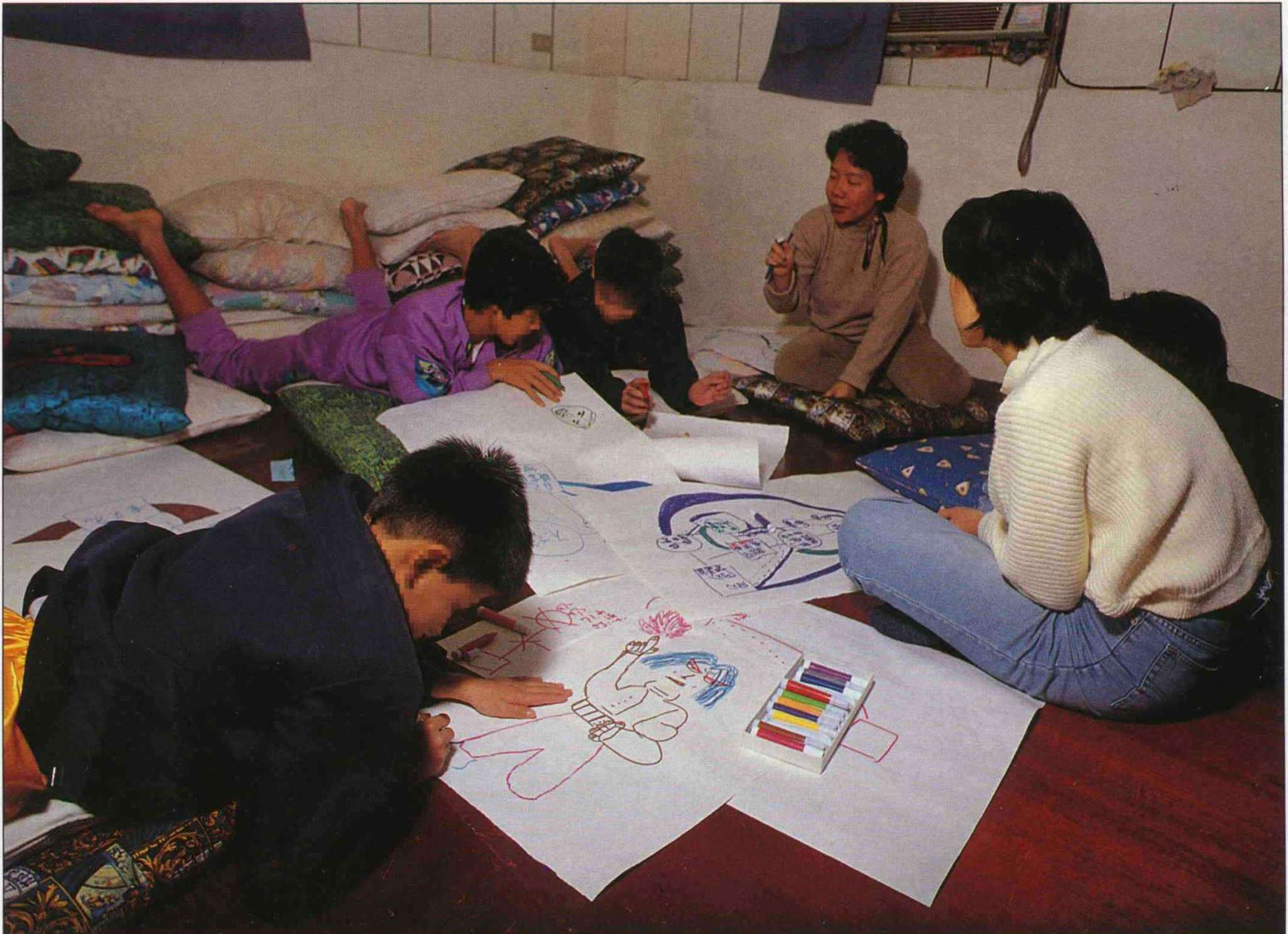 在宜蘭慈懷園全室鋪了地毯,角落堆滿柔軟抱枕、靠墊的遊戲治療室裡,幾個孩子低頭在四開大的白紙上畫畫,紙上只有四方框框和圓圈圖形,以及連結圖形的直線。