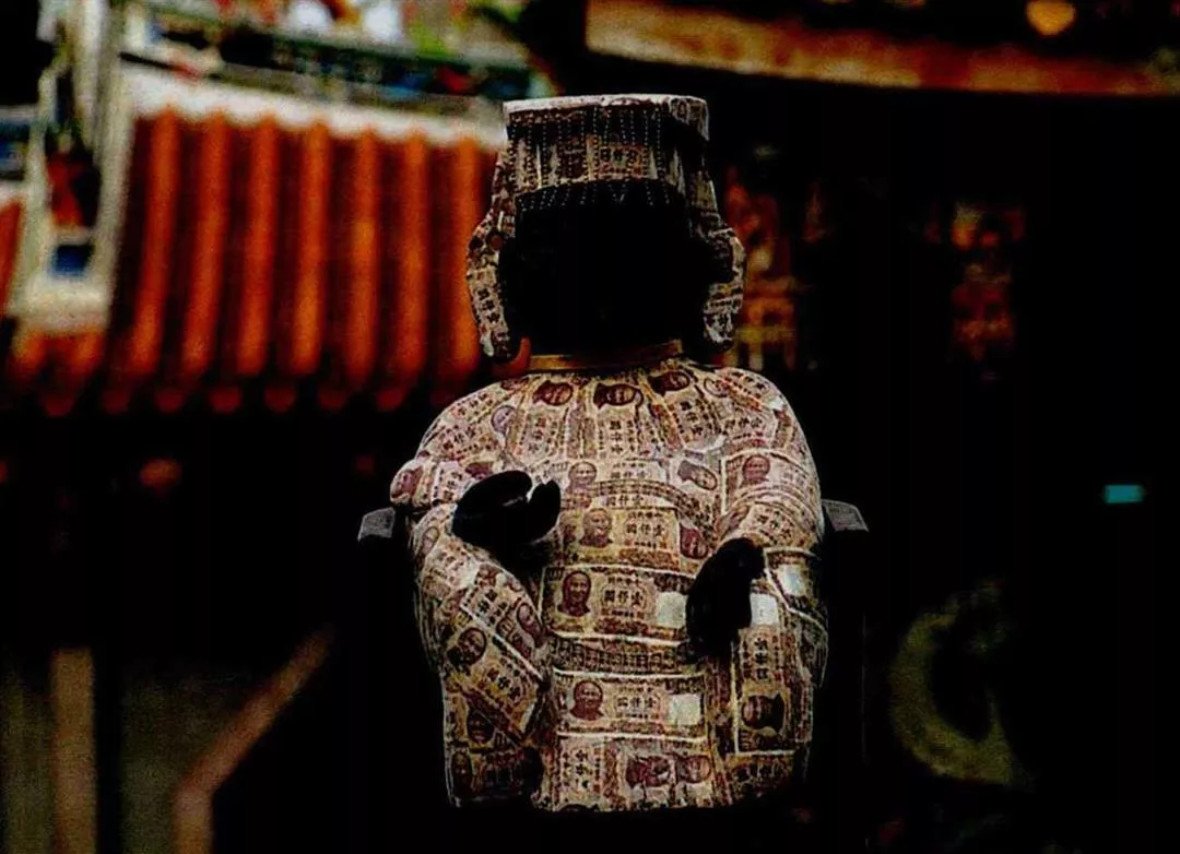 策展人黃海鳴所策劃的《歷史之心》,因為藝術家連寶猜這件貼滿鈔票的媽祖作品,引起鹿港居民的反彈,成為前一陣子的熱門話題。(陳明聰攝)(陳明聰攝)