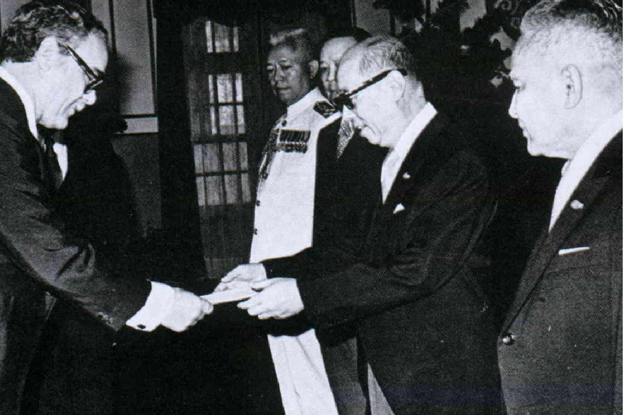 新聞畫頁 1976 6月 EN 分享: 南非共和國首任駐華大使朴多利五月二十五日上午前往總統府,向嚴總統呈遞到任國書。我中華民國與南非原爲領事關係,由於多年來的友好合作,遂於本年四月二十六日提升爲大使級關係。 南非共和國首任駐華大使朴多利五月二十五日上午前往總統府,向嚴總統呈遞到任國書。我中華民國與南非原為領事關係,由於多年來的友好合作,遂於本年四月二十六日提升為大使級關係。 美國軍事援華顧問團新任團長馮納准將偕夫人,五月二十六日上午搭機來華履新,我國參謀總長賴名湯上將夫婦在台北松山機場迎接。馮納准將出生於我國天津市,能說流利的華語,曾經兩度來華在顧問團服務。 一座六公尺高的總統蔣公全身銅像,五月十五日在日本東京附近多摩市的櫻丘公園揭幕。這座銅像是日中民間親善協會所恭立,以表達日本人民對總統蔣公在第二次世界大戰結束時對日本寬大為懷的感念之忱。此一總統蔣公銅像,儀容威嚴,底座為大理石,高達九公尺,正面鐫有七個中國字:「以德報怨謝恩像」。美國軍事援華顧問團新任團長馮納准將偕夫人,五月二十六日上午搭機來華履新,我國參謀總長賴名湯上將夫婦在台北松山機場迎接。馮納准將出生於我國天津市,能說流利的華語,曾經兩度來華在顧問團服務。一座六公尺高的總統 蔣公全身銅像,五月十五日在日本東京附近多摩市的櫻丘公園揭幕。這座銅像是日中民間親善協會所恭立,以表達日本人民對總統蔣公在第二次世界大戰結束時對日本寬大爲懷的感念之忱。此一總統蔣公銅像,儀容威嚴,底座爲大理石,高達九公尺,正面鐫有七個中國字:「 以德報怨謝恩像」。 分享: