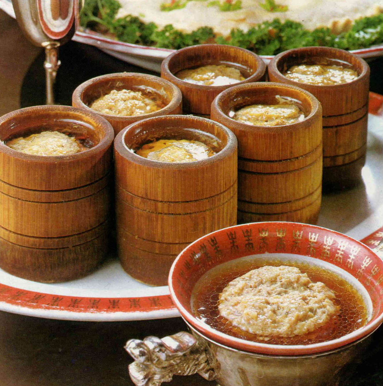 這是一道在台灣所創始的湖南名菜,不但容器別緻新穎,盅內所蒸出之肉丸清爽鬆嫩,且氣味芬芳,而湯汁更是清澄、鮮美,四季咸宜。雖然菜館製作此菜名目繁多,分為竹節鴿盅、竹節肝盅、竹節肉盅、香瓜鴿盅、蕃茄肉盅等,但基本做法則完全相同只將容器種類加以變化或是所使用之肉配合稍加增減而已,一般家庭如無此種特製之竹節,不妨改用陶磁茶杯或飯碗。以下將做8個肉盅之材料與程序列出,俾供讀者參考試做。