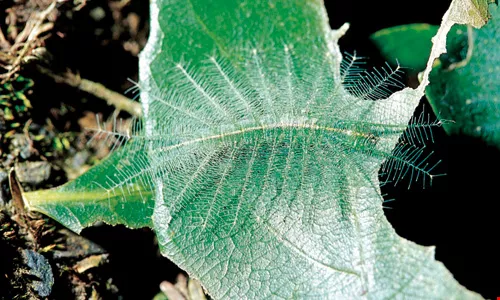 「保護色」是生物躲避天敵的利器,圖中的「綠蛺蝶毛蟲」以羽狀側毛融入葉片,藉環境來保護自己。