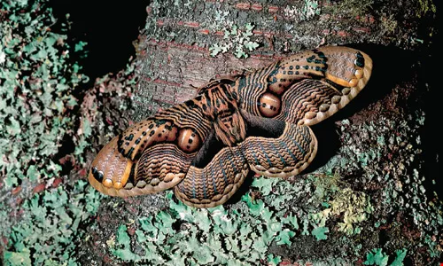利用恐怖的色彩或圖案來驚嚇敵人,是「蘿紋水蠟蛾」的拿手好戲;乍看像龜殼花,細看又像睜開雙眼的貓頭鷹,常讓掠食者退避三舍。