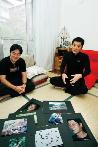 徐仁修(右)位於新店山城的工作室裡,攤開一地在尼加拉瓜攝影的作品,與隨行攝影師黃一峰(左)笑談在尼國荒野被蚊蟲叮咬的窘狀。