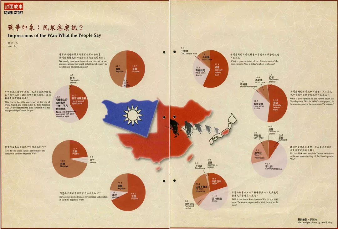 最能透露出民眾對中日戰爭的曖昧情愫的,則是最後一題「你認為中日戰爭時,台灣民眾心底是支持誰?」相當大比例的受訪者聽完問題後躊躇良久,始終拿不定主意。結果認為當時台灣人「應該是」支持中國的比例略佔上風,達41.2%;認為當時台灣人支持日本的,有18.6%;而認為台灣人保持中立或立場不確定的,也合計達到36.1%。