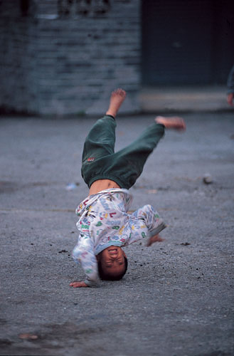 望鄉的孩子不怕生,見到相機也不會怯場,你看他的鐵頭功,可以轉好幾圈呢!