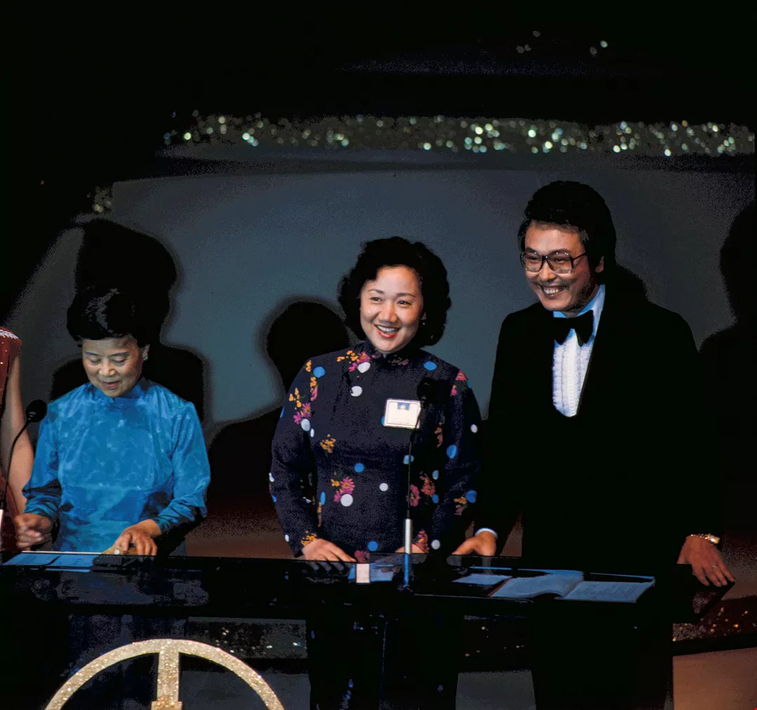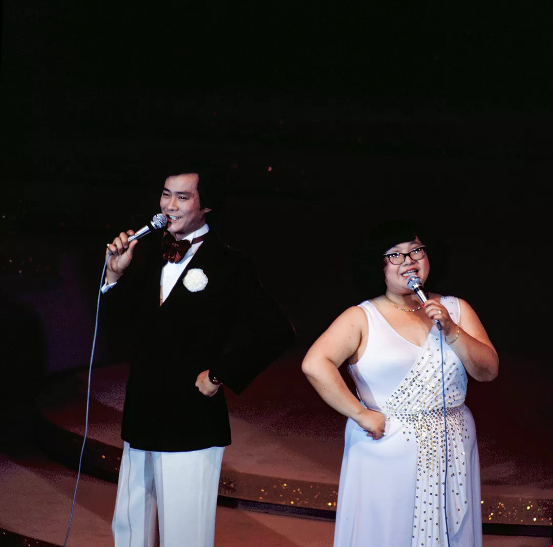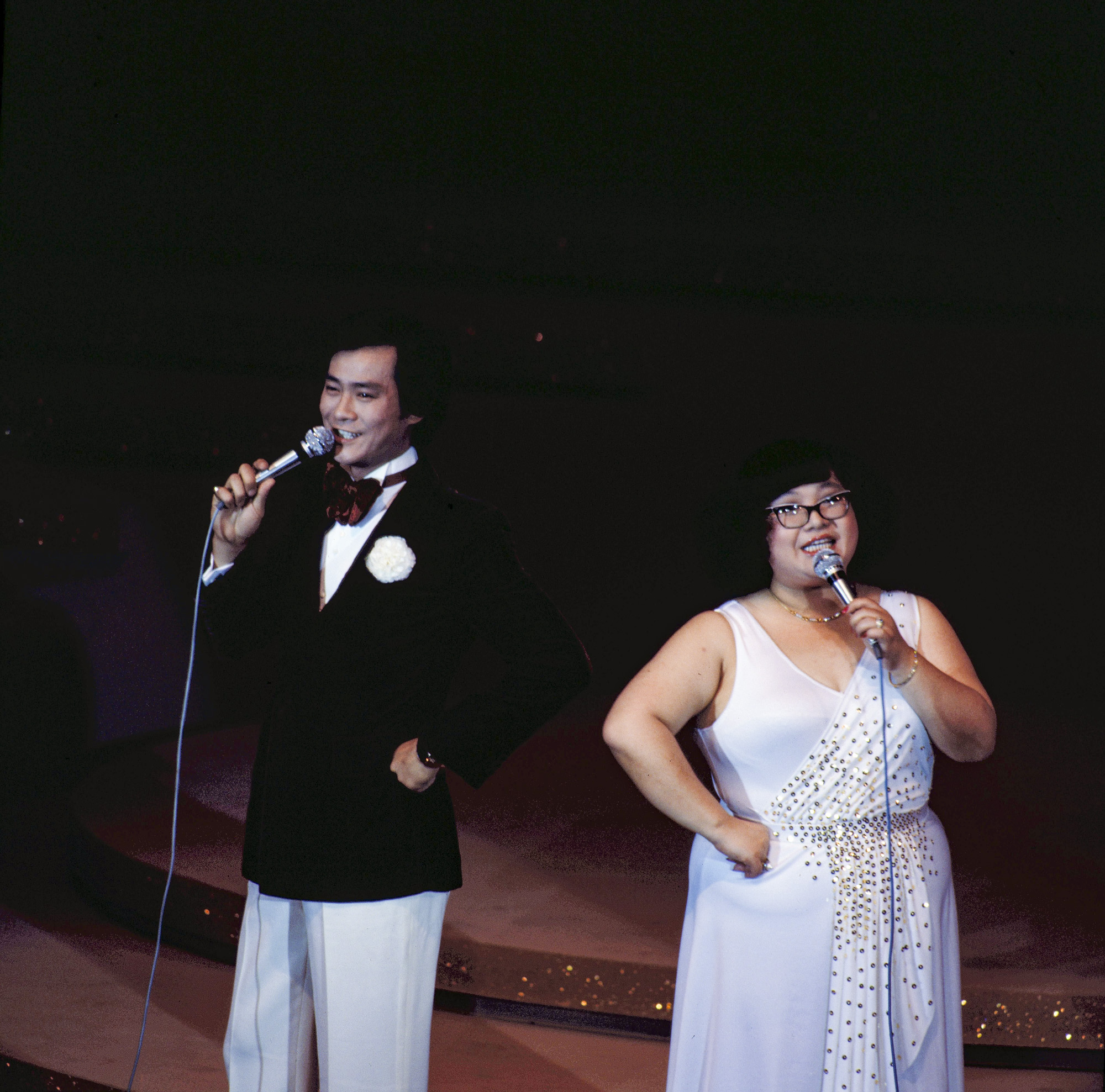 香港麗的電視台紅星薛家燕及張國榮在頒獎典禮中載歌載舞。