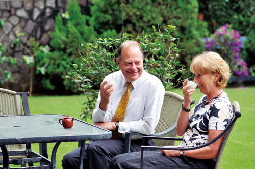 許多長週末,胡浩德把太太Ingrid留在台北,自己上山下海,全台走透透,如今退休後定居台南,太太開出的唯一條件就是──走到哪兒都要帶著她。圖為夫妻倆在天母官邸悠閒品茶。