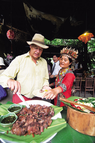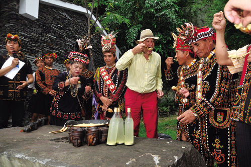 「吃」遍全台各部落的胡浩德,曾多次應邀擔任原住民烹飪比賽的決審委員。圖中他的「義妹」用流利之英語慇懃勸食。