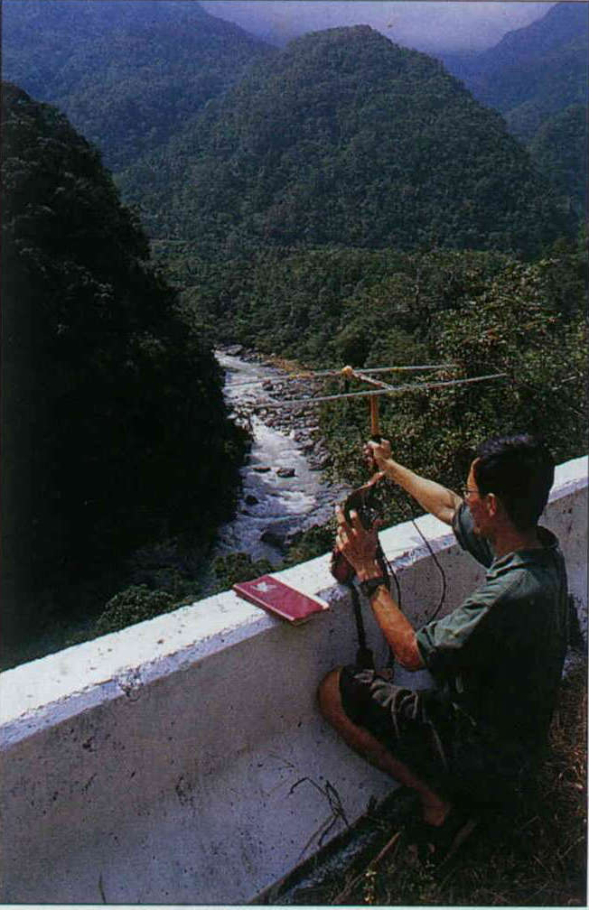 孫元勳調整天線來測定可以接收到黃魚鴞身上發報器訊號的位置。