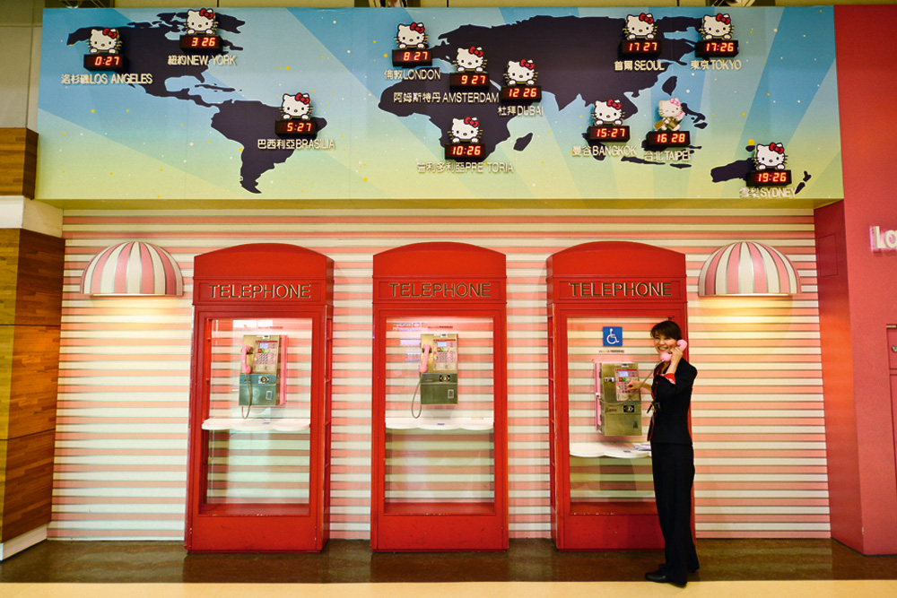 昇恆昌設計的主題候機室,以台灣小吃、台灣映象、中華郵政為主題發想,更有深受歡迎的Hello Kitty世界鐘和電話亭。