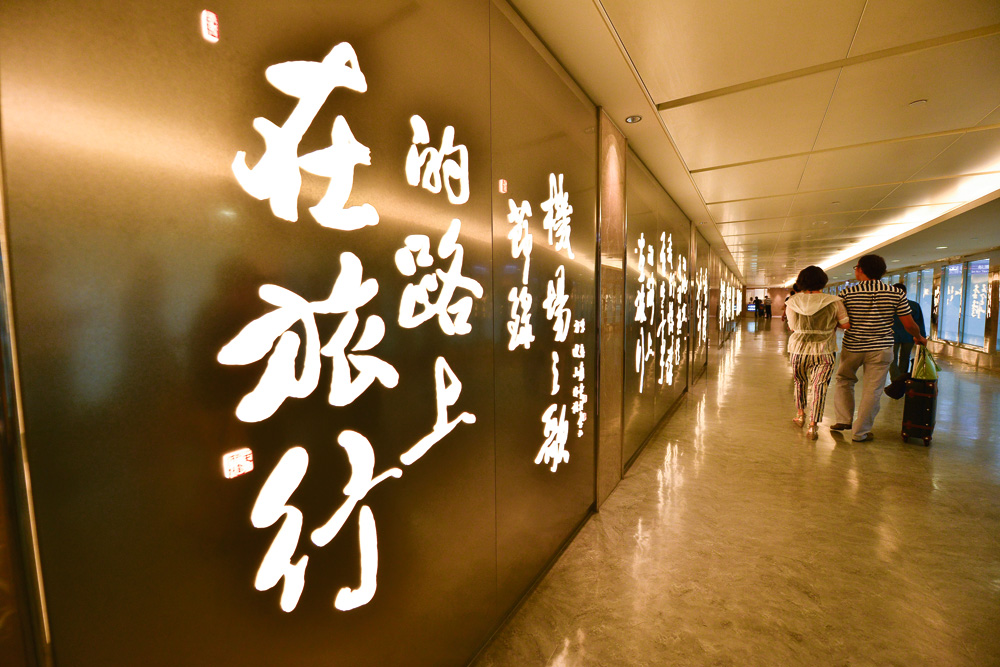 為了呼應第一航廈極力強化的本土特色,昇恆昌請來以中國詩詞風聞名華人音樂界的創作人方文山,譜寫體現台灣在地人文風景及濃情熱意的〈在旅行的路上〉一詞,再由知名書法家朱振南揮毫書寫,並結合LED燈光、壓克力板及金屬板等3種媒材,在登機長廊的入口處,設置名為「文學之牆」的大型裝置藝術作品。