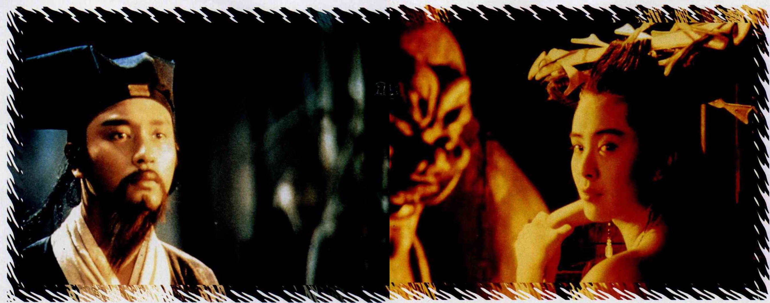 美若天仙、不沾一絲鬼氣的聶小倩在案前提筆做詩,「十里平湖霜滿天、寸寸青絲愁華年;對月形單望相護,」小倩停筆思索著最後一句,卻被姥姥打斷、喚她前去伺候。在外觀看的書生寧采臣走到案前,接下了最後一句「只羨鴛鴦不羨仙」。霎時,原本荒蕪的水池,綻開了一朵朵的荷花,原本無色黑白的影片,蛻幻出一片生氣色彩,展開了書生與女鬼的一段浪漫情愛。