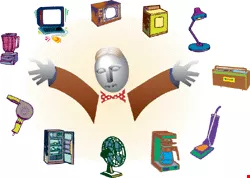 「家庭自動化」是目前資訊科技的應用新領域,由智慧管家替你應門、吸塵、煮咖啡、開關電燈……,豈不酷斃了?(蔡智本設計)