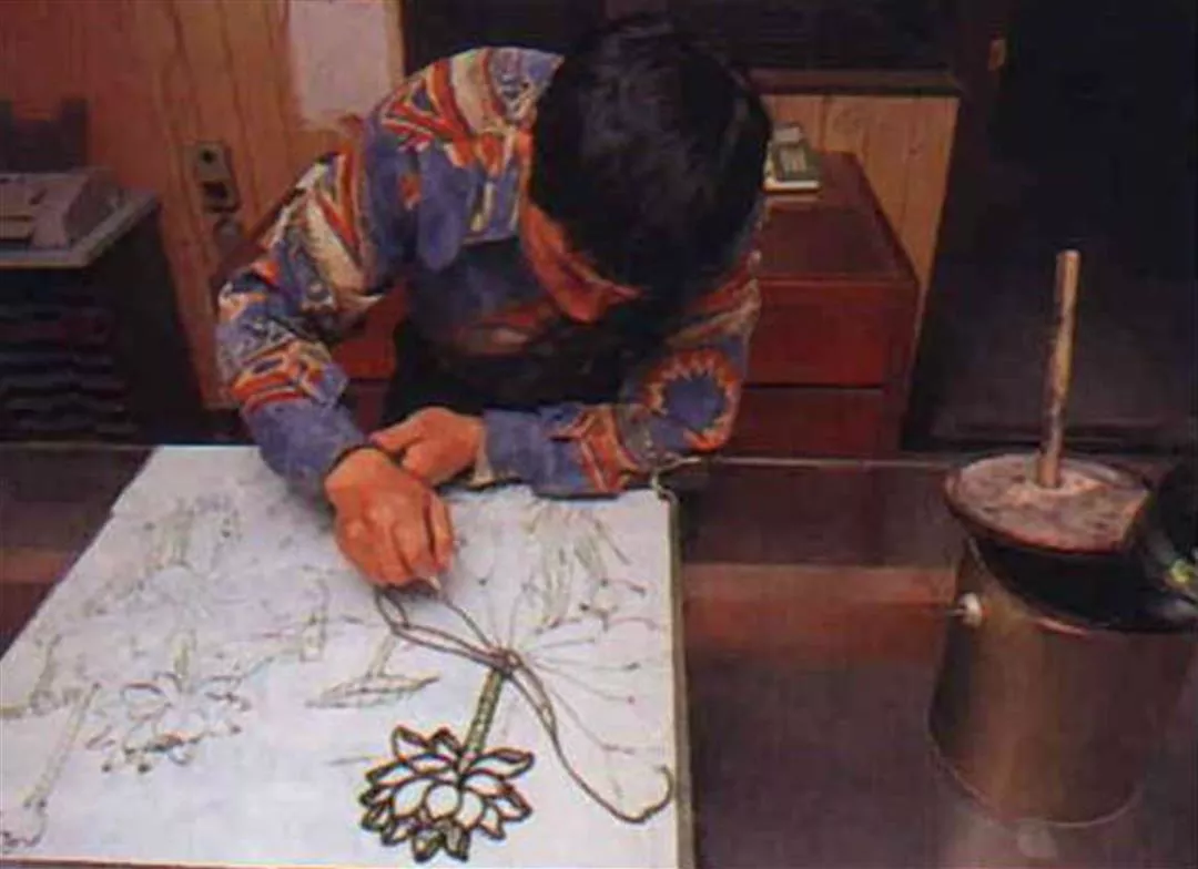接著就要上瀝粉,材料是熬煮的水膠加上石粉所調成的膏狀物,將之裝入腳踏車內胎的橡皮管,前端接上一個圓錐形的漏斗,依照線條粗細,漏斗有著不同大小的孔隙,然後就像作蛋糕擠花一般,一邊擠出膏粉,一邊勾勒出繁複、立體的龍鳳圖案線條來。瀝粉工作完成後,接著上色。為求圖案顏色不至於太過生豔,上色講究「韻法」,也就是在色與色之間還要加上細細的白色線條,讓紅黃藍綠金這樣強烈的五色顯得協調,稱為「退暈」。