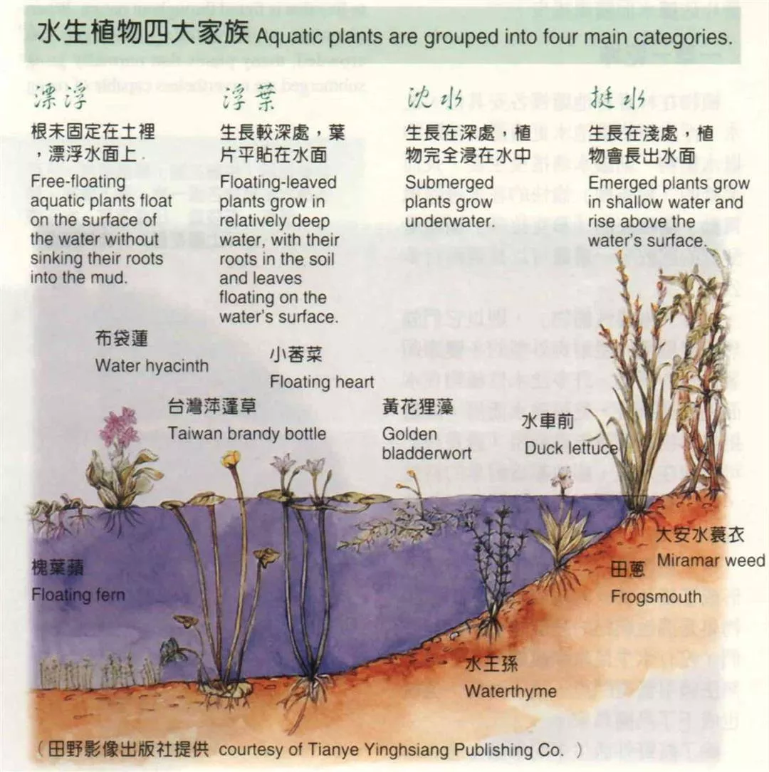 水生植物四大家族 漂浮 根未固定在土裡,漂浮水面上 浮葉 生長較深處,葉片平貼在水面 沈水 生長在深處,植物完全浸在水中 挺水 生長在淺處,植物會長出水面。(邱瑞金)