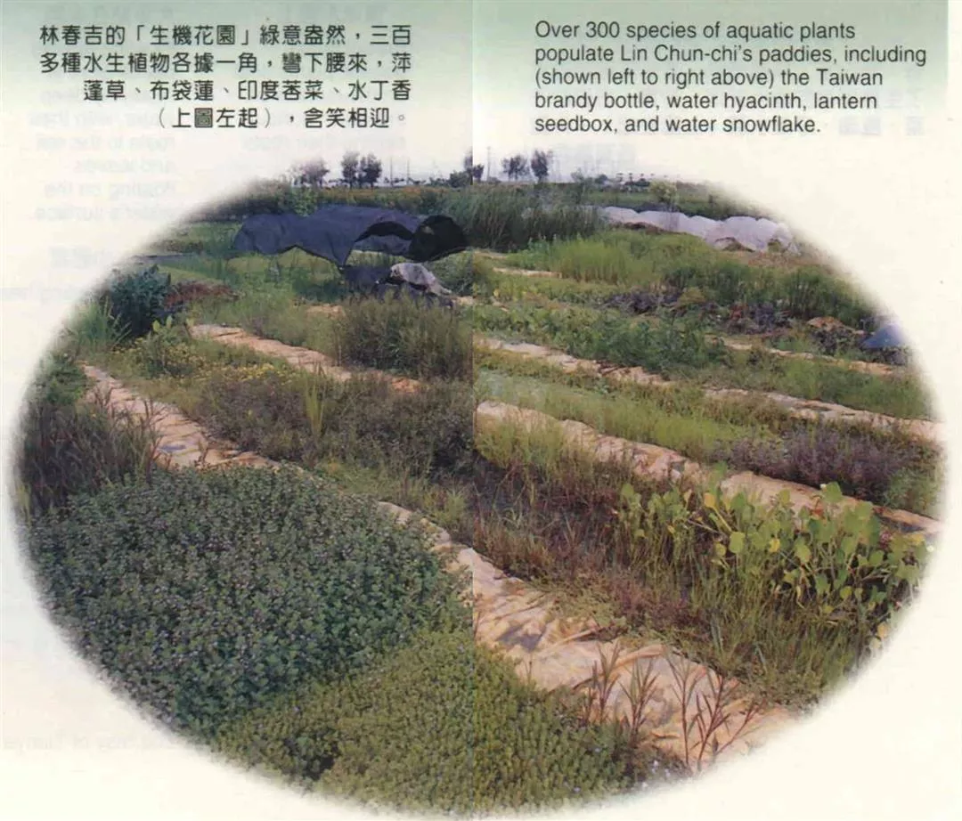 林春吉的「生機花園」綠意盎然,三百多種水生植物各據一角,彎下腰來,萍蓬草、布袋蓮、印度莕菜、水丁香(上圖左起),含笑相迎。(邱瑞金)