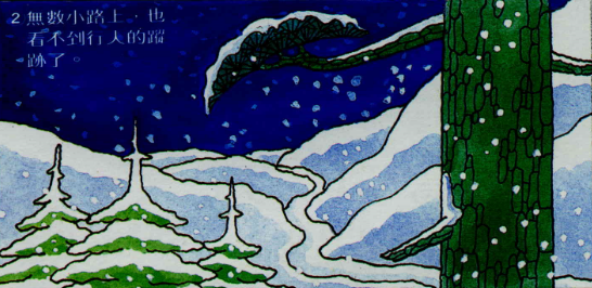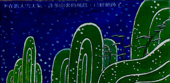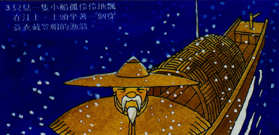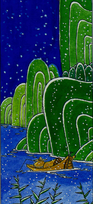 江雪 文‧圖.洪義男 圖‧洪義男 1987 11月 EN 分享: 千山鳥飛絕,萬徑人蹤滅。 孤舟蓑笠翁,獨釣寒江雪。 ——柳宗元(773—819) 1.在這大雪天氣,許多田裡的飛鳥,已經絕跡了。 2.無數小路上,也看不到行人的蹤跡了。 3.只見一隻小船孤伶伶地飄在江上,上頭坐著一個穿蓑衣戴笠帽的漁翁。 4.他獨自在那寒冷的江上釣雪天的魚。 分享: