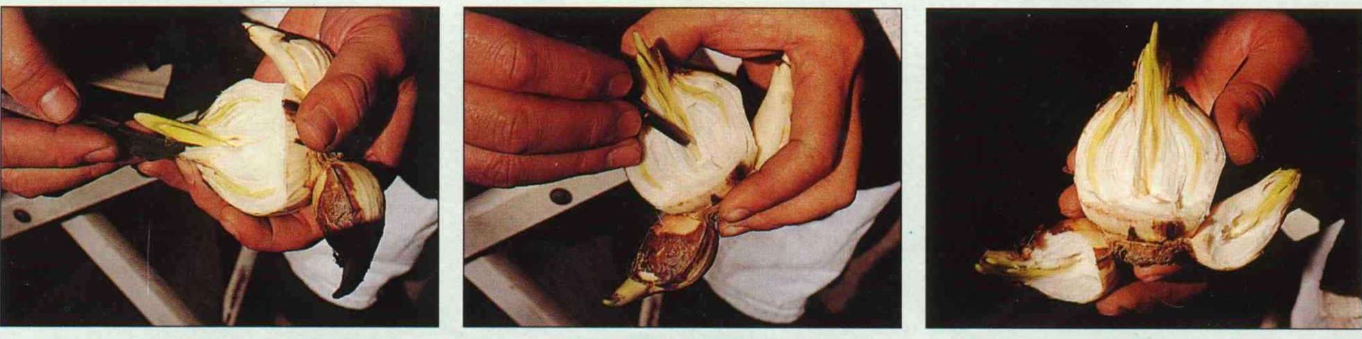 李珂提醒,選好健康的球莖之後,下水前要記得先作開口處理,在花頭腹背兩面(側芽方向)各開長約兩公分的口,以利次芽平均生長,但要注意不可過深(約三四層鱗片),以免傷及花芽。
