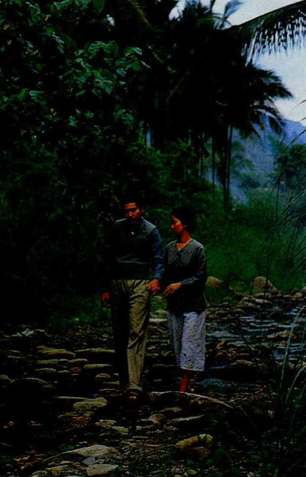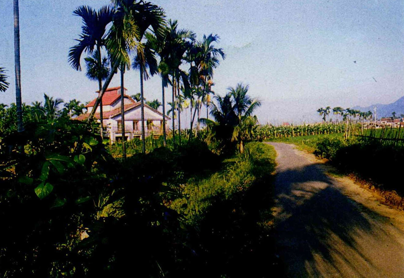 我們搭乘的計程車行駛在田間小路上,「天,和雲、和山的倒影,靜靜地躺在注滿了水的田隴堙K…」鍾理和文章中的景緻,赫然全部呈現眼前。他筆下的美濃,還是一樣的蒼綠秀美;他筆下的客家婦女,也仍舊健康、勤勞而開朗。我們不時可以看見椰林中聳立一角高高突出的菸樓,待十二月時,當美濃一帶開始採收菸葉時,這些菸樓就會開始往青藍的天空冒煙了。