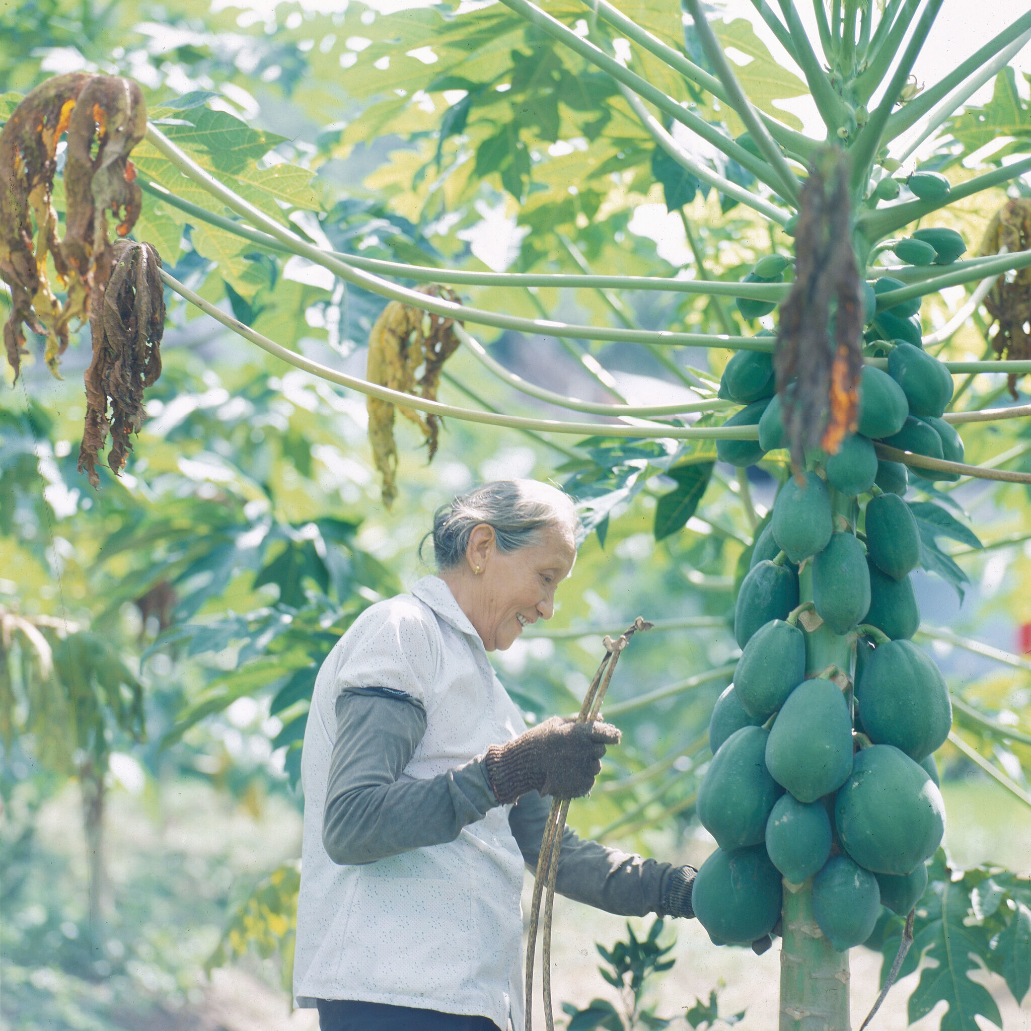 雖然孩子都大了,可以享享清福了,但一生勤奮慣了的台妹,卻耐不住清閒,不時到木瓜田裏走動,做些農事。