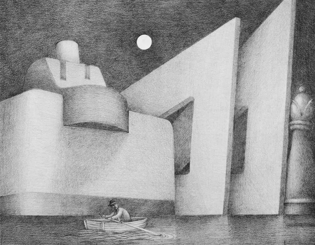 《月光》筆觸細緻柔和,創作者化身旅人,在工作桌上展開一場奇幻旅程,是2013年波隆那插畫展入選作品。