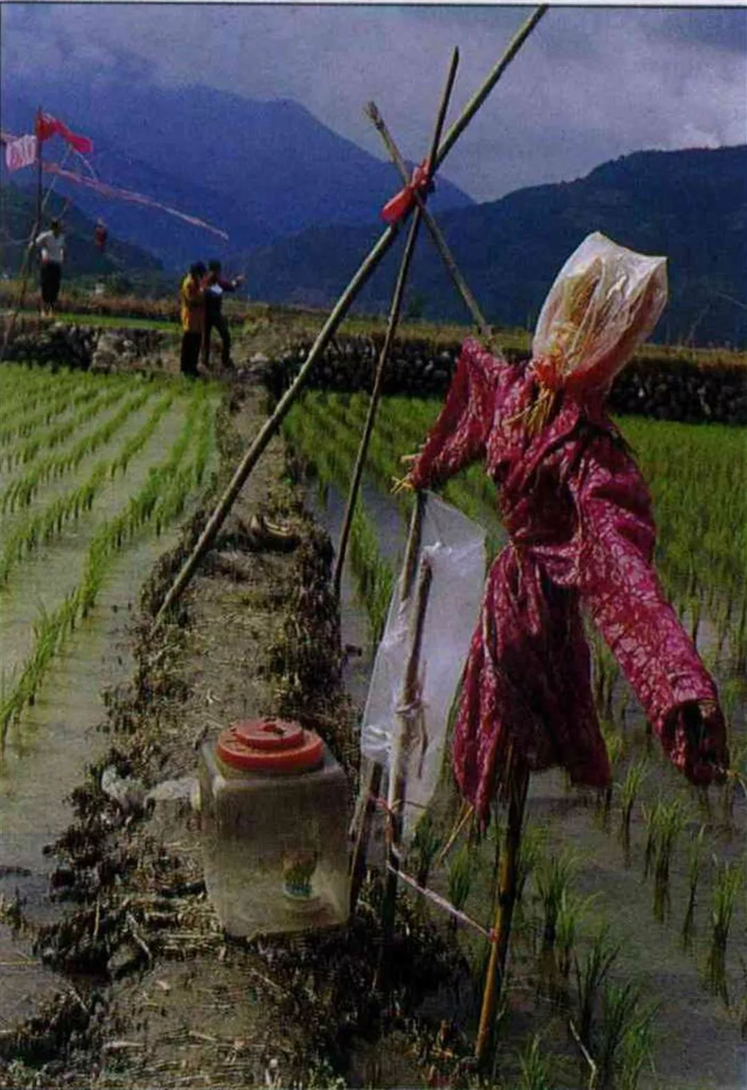 農民不堪其擾,反制行動也一一展開。除了各種極盡真人打扮的稻草人不斷粉墨登場,如今沿著與秀姑巒溪平行的玉里產業道路迆邐而行,但見溪畔綠汪汪的稻田間,花、白各色旗海飄揚,尼龍繩、塑膠袋做成的萬國旗於空中飛舞。