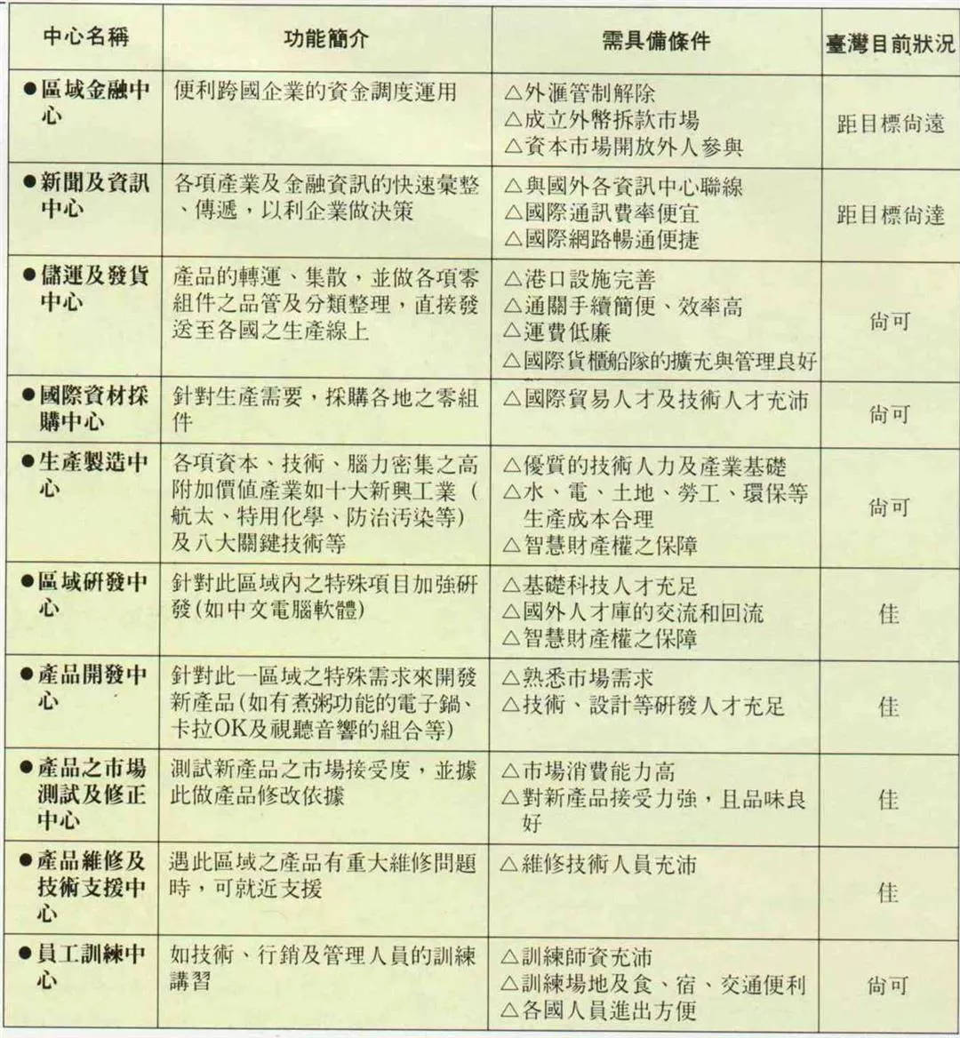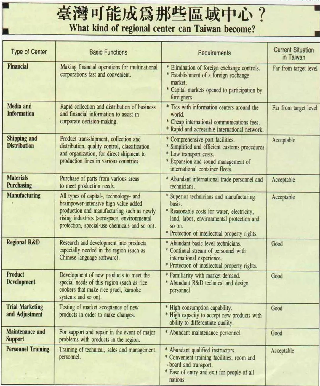 今年五、六月間,經濟部長蕭萬長首先提出希望自由中國台灣成為大型跨國企業在亞太地區「區域營運中心」的計畫,即(ROC,Regional Operation Center),並且將這裡做為跨國企業的「多元利潤中心」之一。其中內容包含甚廣,包括使台灣成為亞太區域中的研究發展中心,高科技產品的生產製造中心,新產品的開發、測試或維修中心,人員訓練中心,策略聯盟中心,資材採購中心,乃至於資金調度中心、儲運發貨中心……等等。(說明請見附表)
