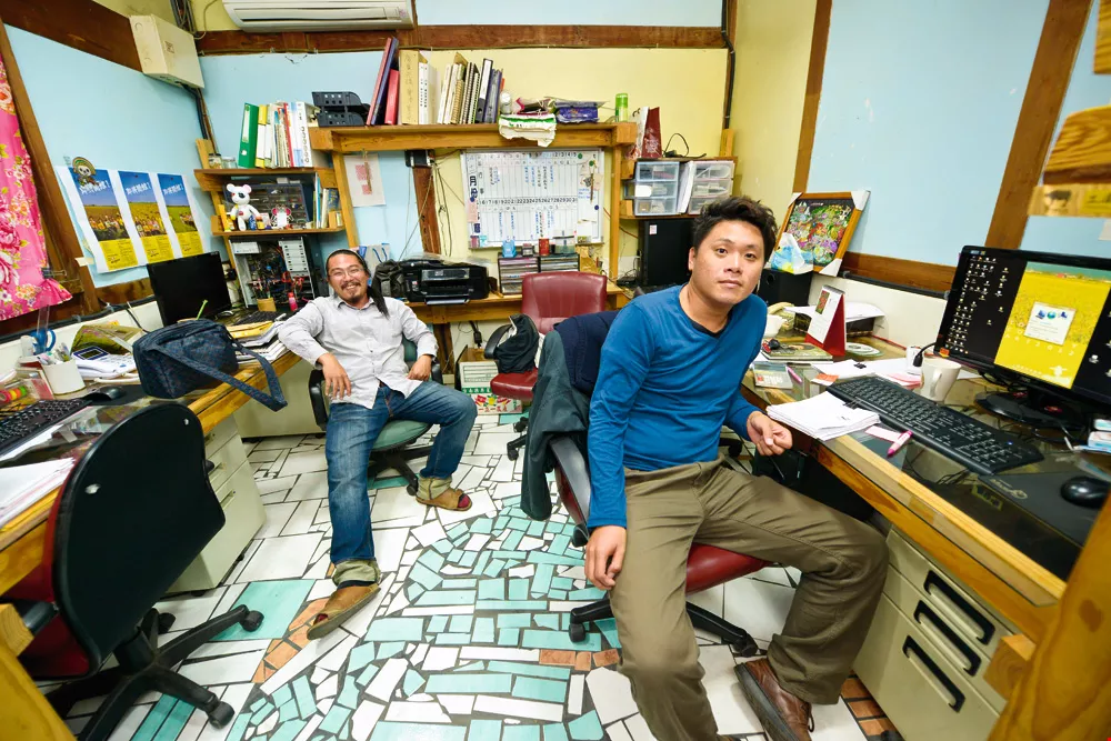 陳昱良(左)與黃鼎堯兩位南藝大畢業生,在台南後壁土溝村創立「優雅農夫」品牌,讓藝術與聚落結合。