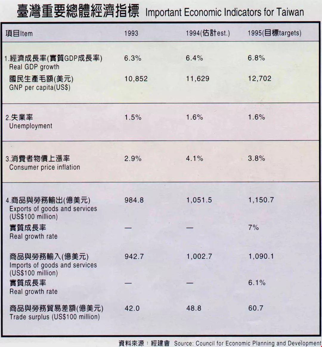 以通常是出口淡季的十一月來說,出口值高達九十四億美元,比九三年同期成長廿六%,進口值也同樣亮麗,成長了卅五%;兩者相加,創下七年來進出口貿易總額的最高成長記錄。十二月中,經濟合作暨發展組織(OECD)公佈的最新報告中,則將九四年台灣經濟成長率(六.四%)列為全球第七,算是維持住「優等生」的形象。