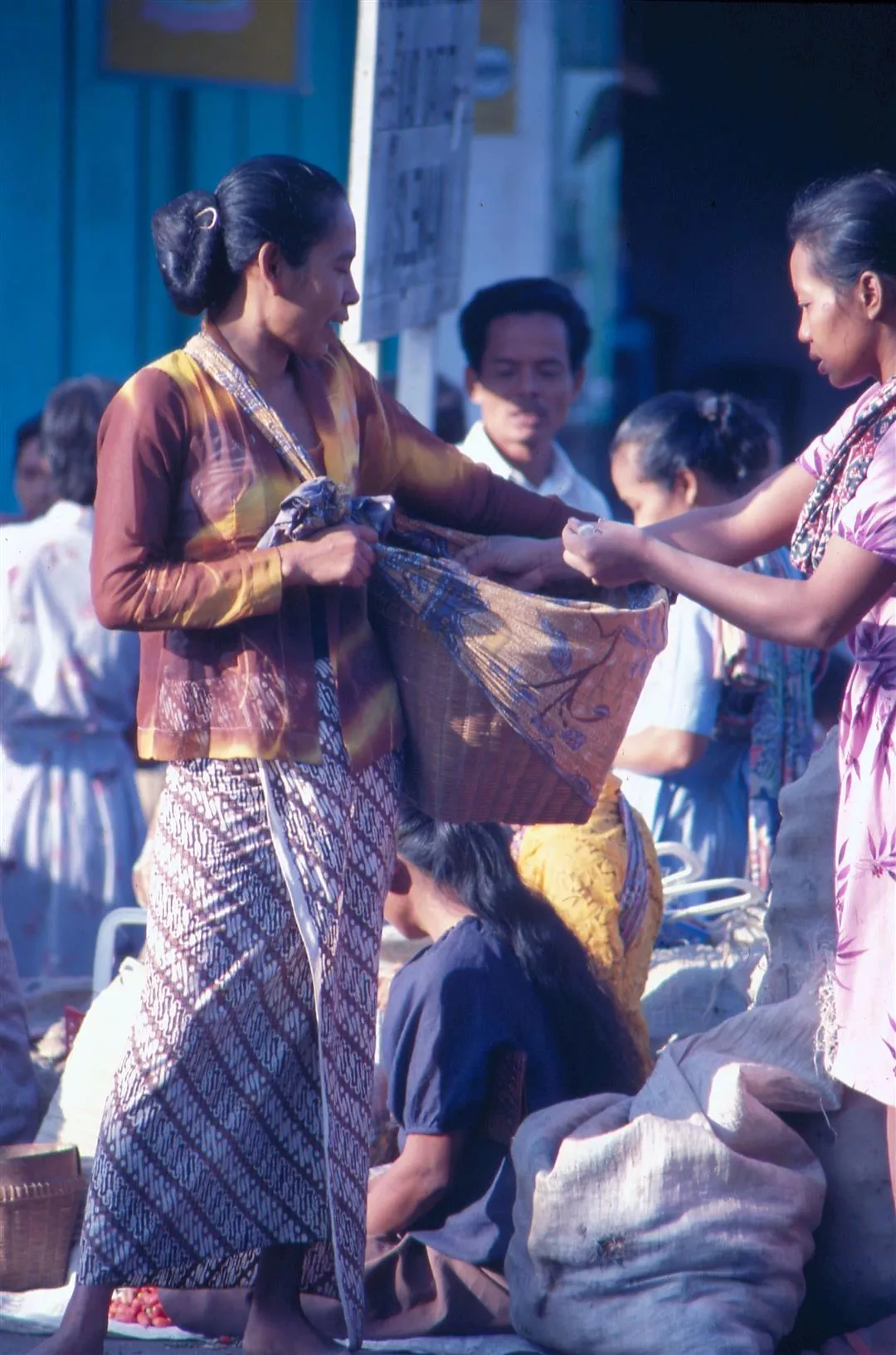 圖4:印尼婦女多以竹籃盛物,圖為婦女在市集買菜的情形。(鄭元慶)