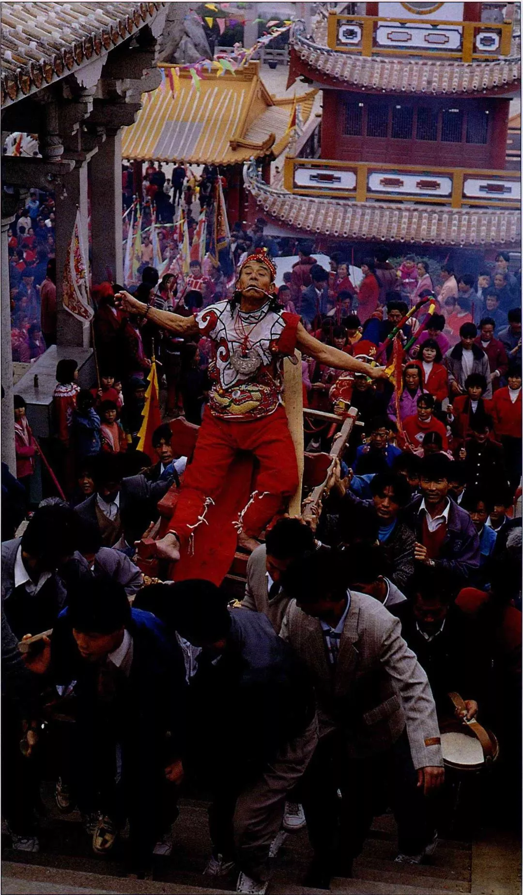 「要吃花了!」在一聲召喚下,眾人又擠向廣場邊搭好的高台。只看數十支大煙花同時點燃,兩個乩童赤膊上身,俯身向前,像是在享受煙花大餐。問圍觀小女生怕不怕,她們異口同聲地回答「不怕,我們看多了呢!」