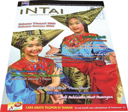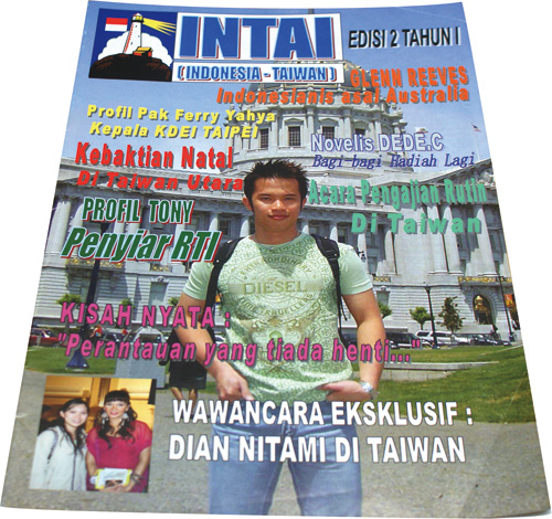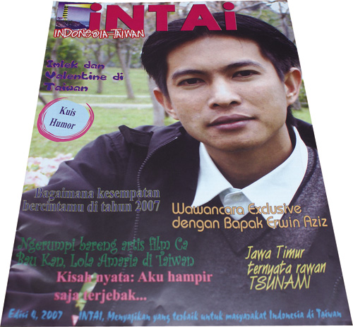 「INTAI」的封面人物囊括各行各業、男女老少的在台印尼人。左一為僅有16頁的創刊號,目前雜誌已「進化」為100頁、專業排版的精緻刊物。第二期(左二)封面人物即是「粉絲很多」的央廣印尼語召集人譚雲福。
