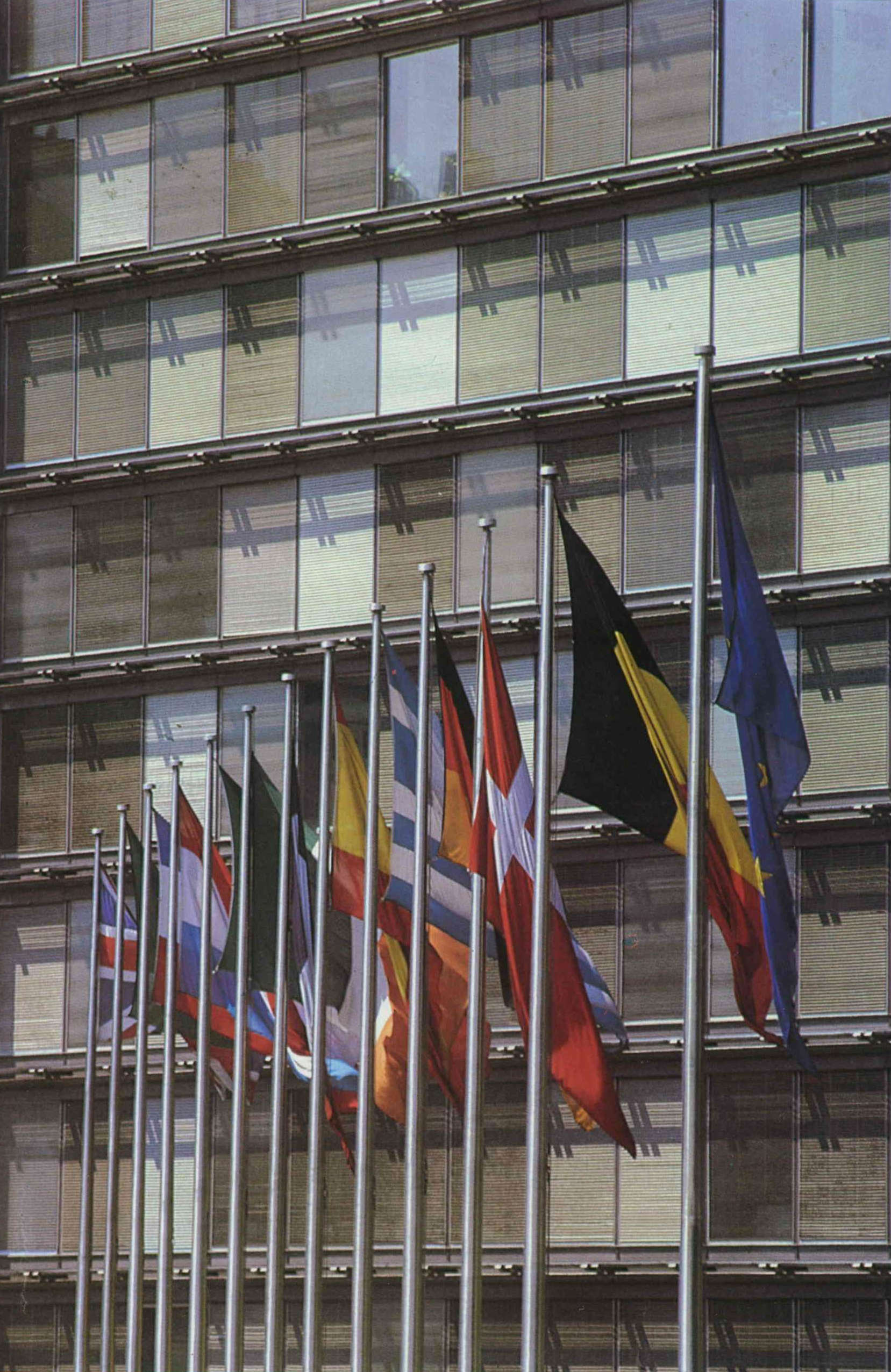 歐市十二國的國旗在總部前迎風飄揚;隨著東歐政情轉變,未來可能有新國旗加入。(鄭元慶)