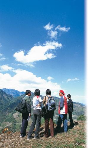 蔚藍晴空下,原住民青年正向都市來的遊人解說「獵人古道」的典故。近年許多偏遠部落的旅遊產業欣欣向榮,但如何才能持續發展,仍有許多挑戰。