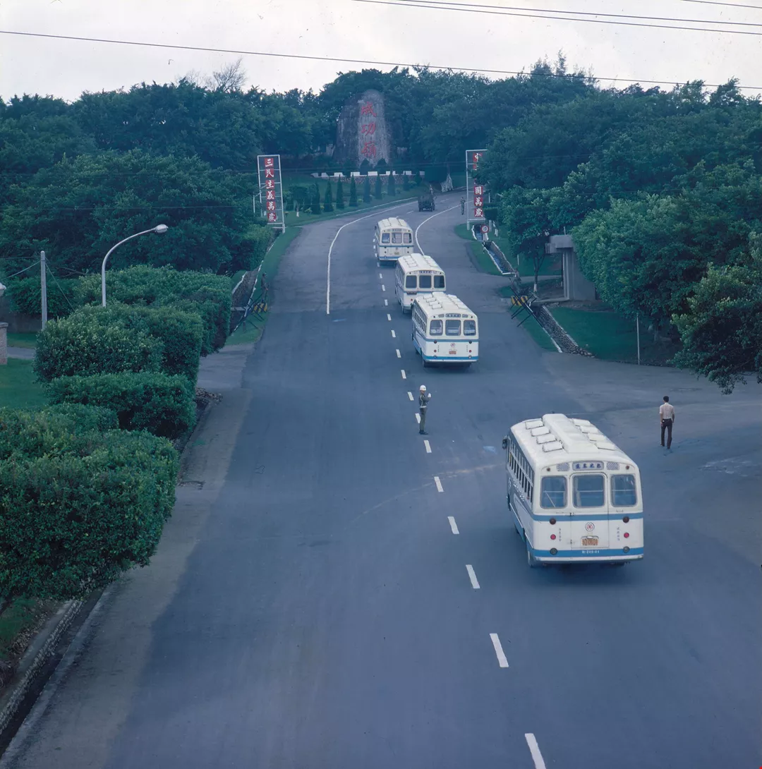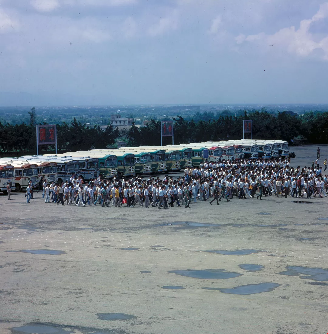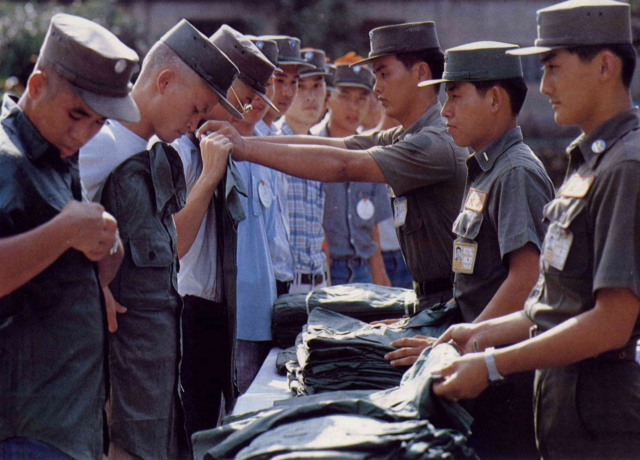 在教育班長的引導下,入伍新生穿著各色各樣的便衣,踏著不太整齊但精神抖擻的步伐,步出車站,登上等候在車站前的長排車隊。