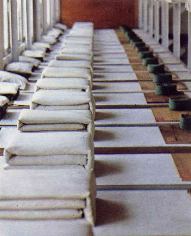 常常起床號還沒有吹響。就有幾個特別緊張的人起床,蟋蟋嗦嗦地開始和棉被奮戰。「十二個稜角、十六條稜線,一個也不能少。」班長的命令在耳邊迴響。但在剛開始時,雖然又推、又拉、又拍、又捏,累得滿頭大汗,就是捏不出有稜有角的形狀。