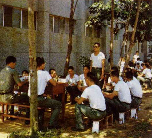 好不容易班長一聲「進餐廳」,大家才暫時喘了一口氣。進入餐廳後,六人一桌,大家都因消耗太多而感飢腸轆轆,甚至聽得到彼此腹內的低鳴。班長卻好像永遠不會餓似的,猶自重覆那千百遍而不倦的話: