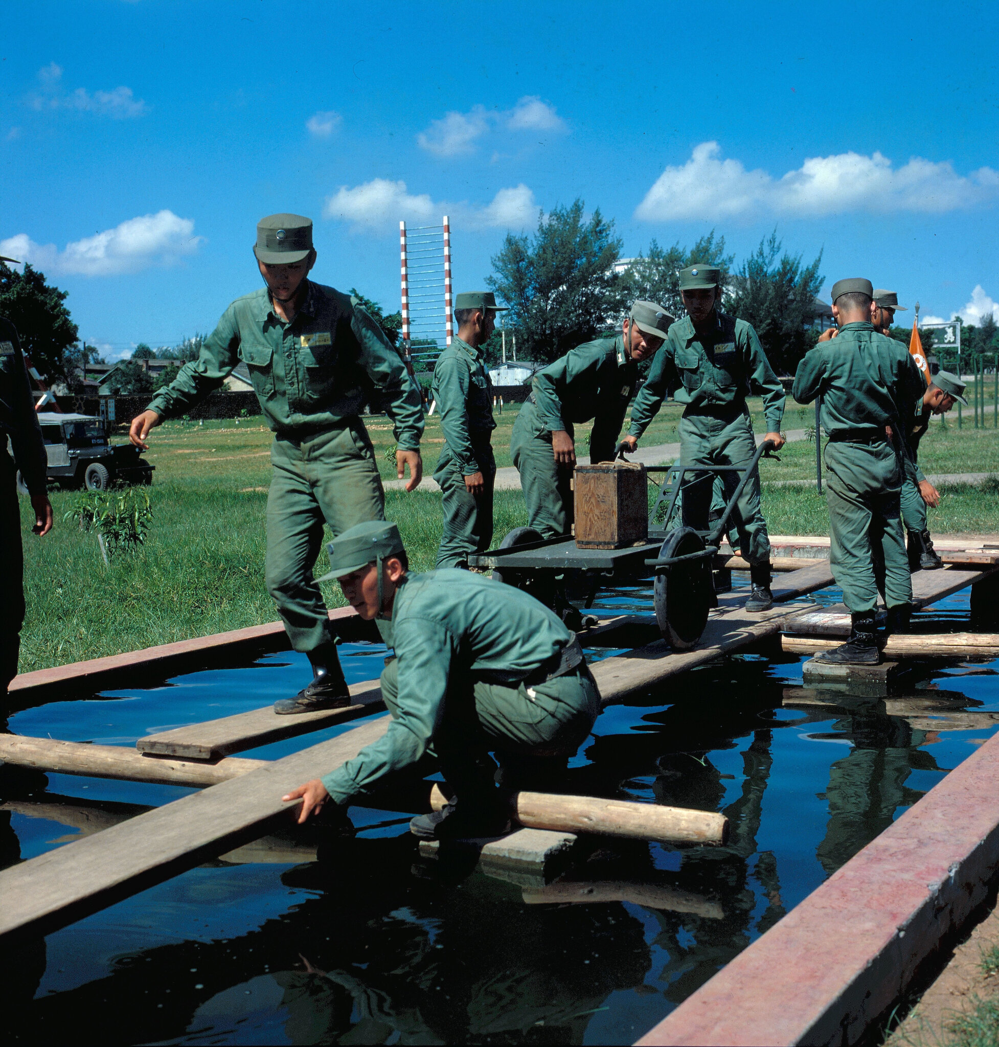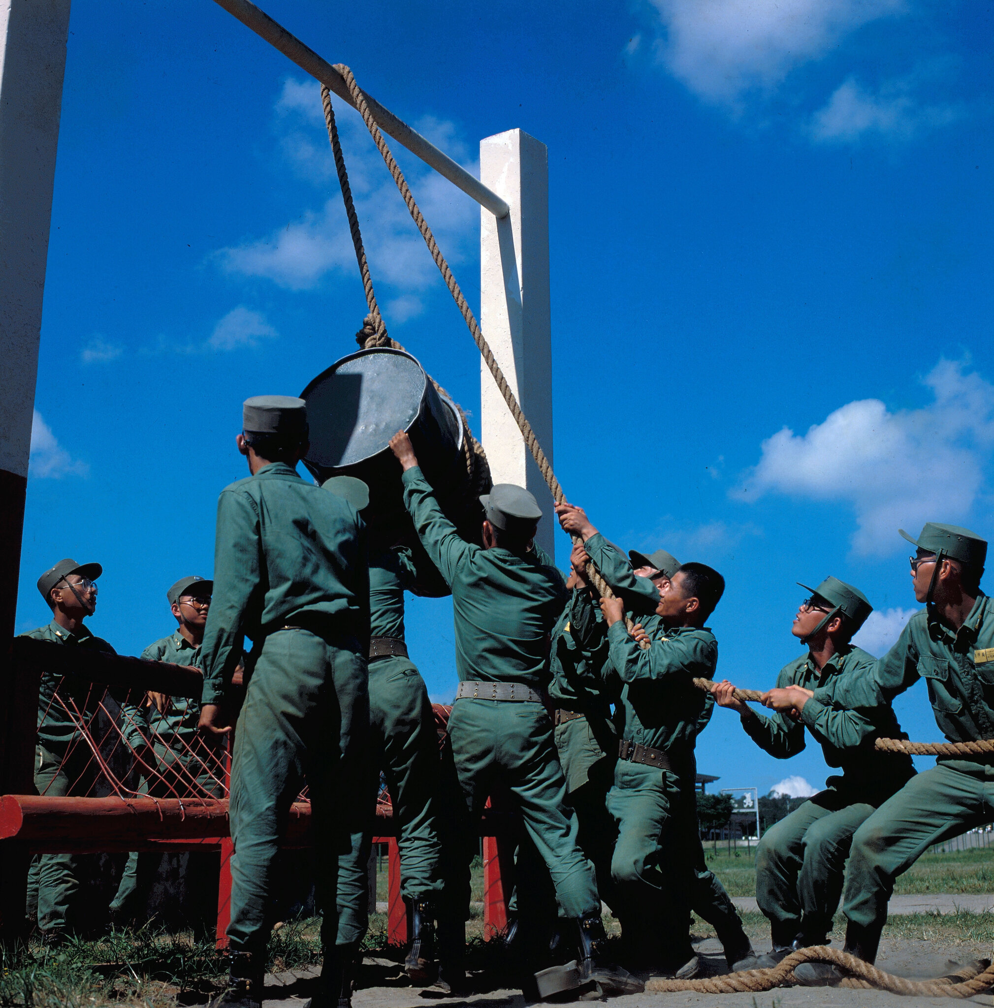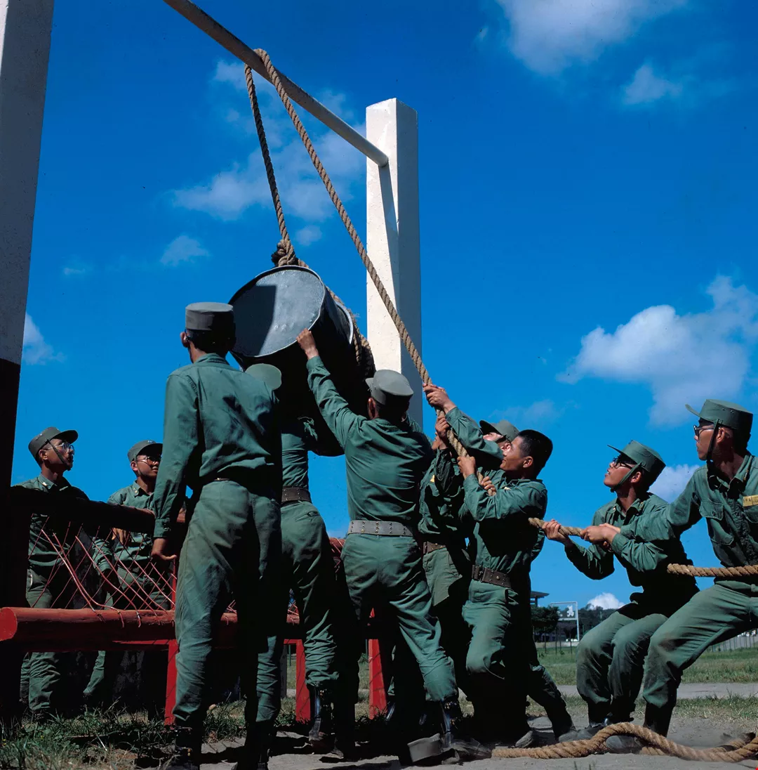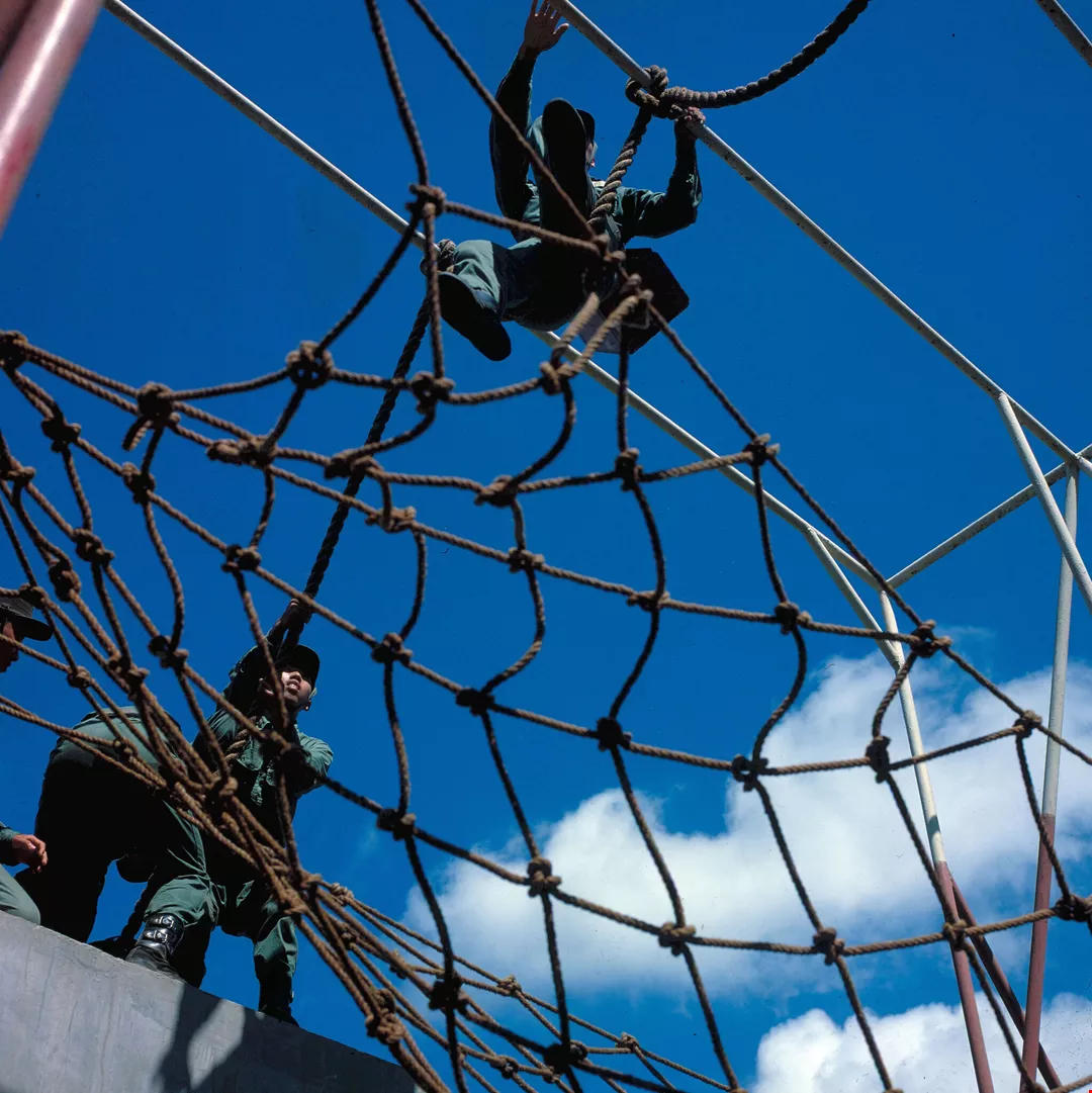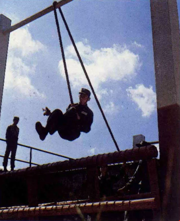 這項訓練一共有十二站,每一站都模擬戰場上可能遭遇的緊急情況:像如何利用三塊不夠長的木板,通過斷橋,而且要運送五十三加侖盛滿的油桶。又如在俘虜營裡,只有一個不及牆高的梯子和長短繩各一條,如何逃出去。這種訓練,鍛鍊學生運用心智,面對困難,齊心協力去克服。每通過一站,大家心裡就有一分紮紮實實的成就感。