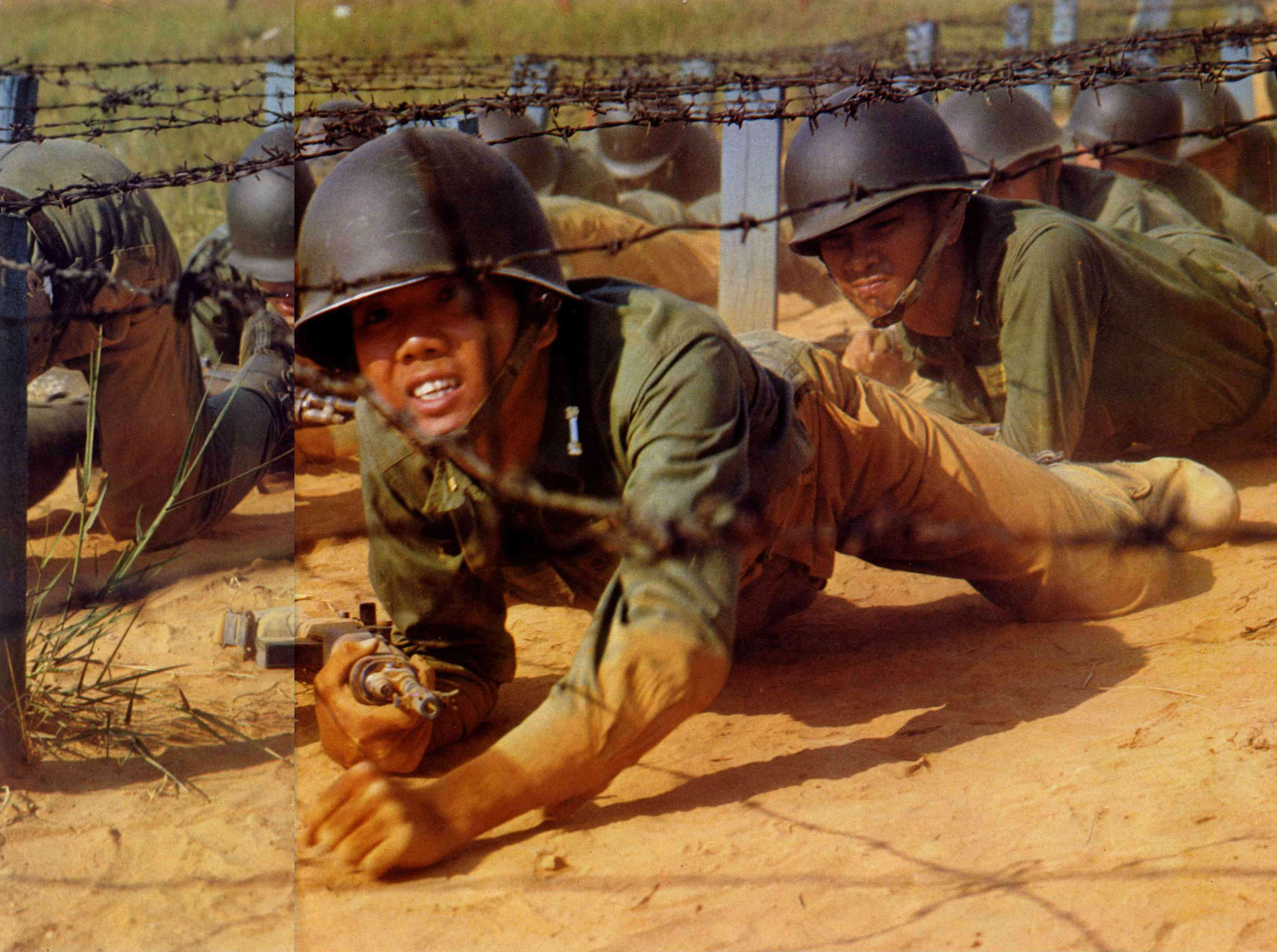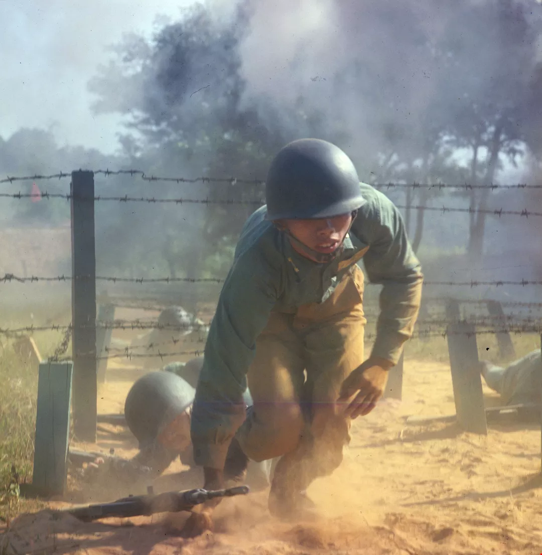 一百五十公尺的距離,爬著爬著,學生們手腳都漸漸沒有力氣了。但大家跟著班長,咬緊牙關硬撐下去。在震人耳膜的槍砲聲中,他們似乎已分不清這是戰爭、或是訓練,只知道奮力往前爬,去攻擊前方的一個據點。