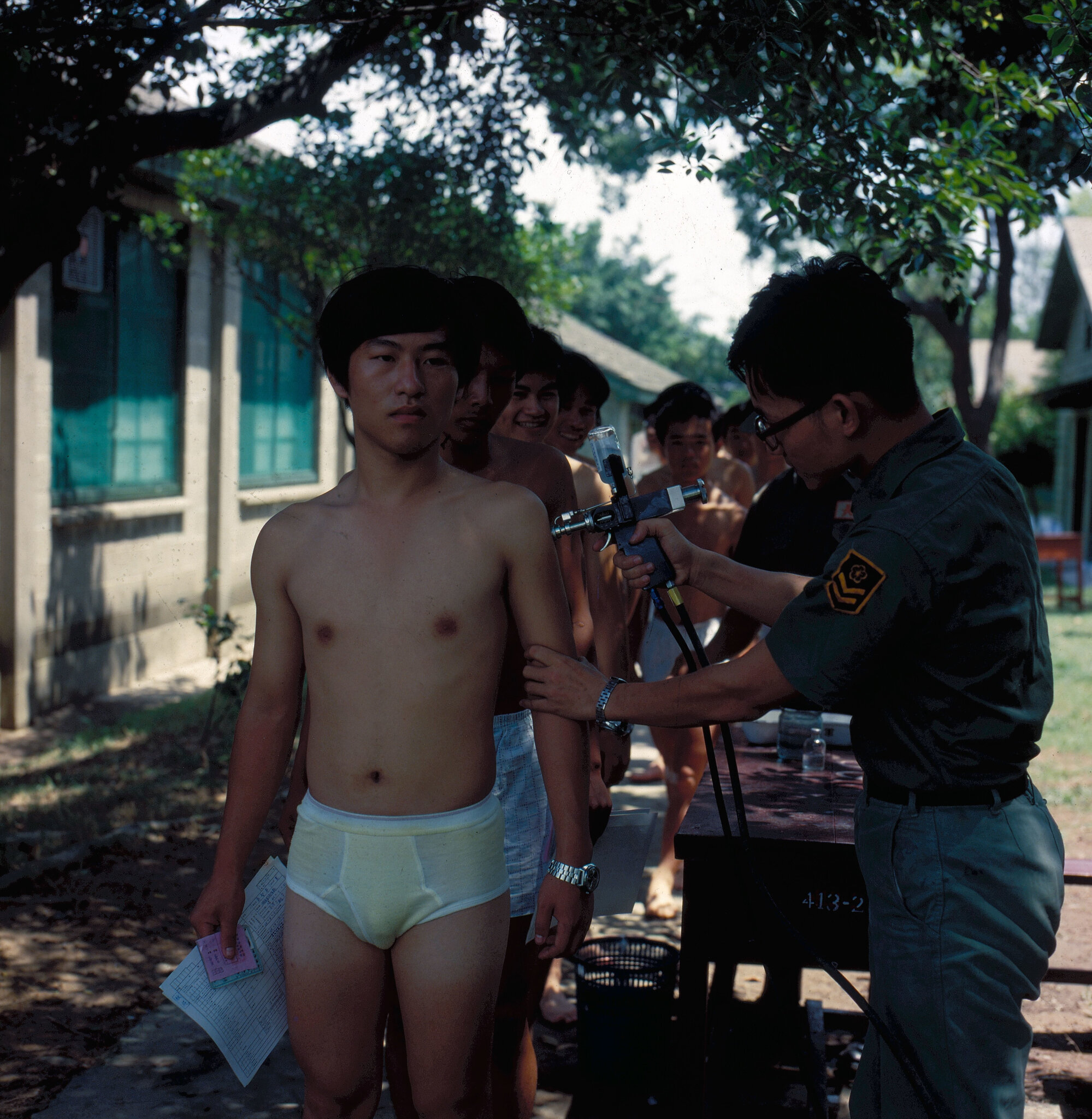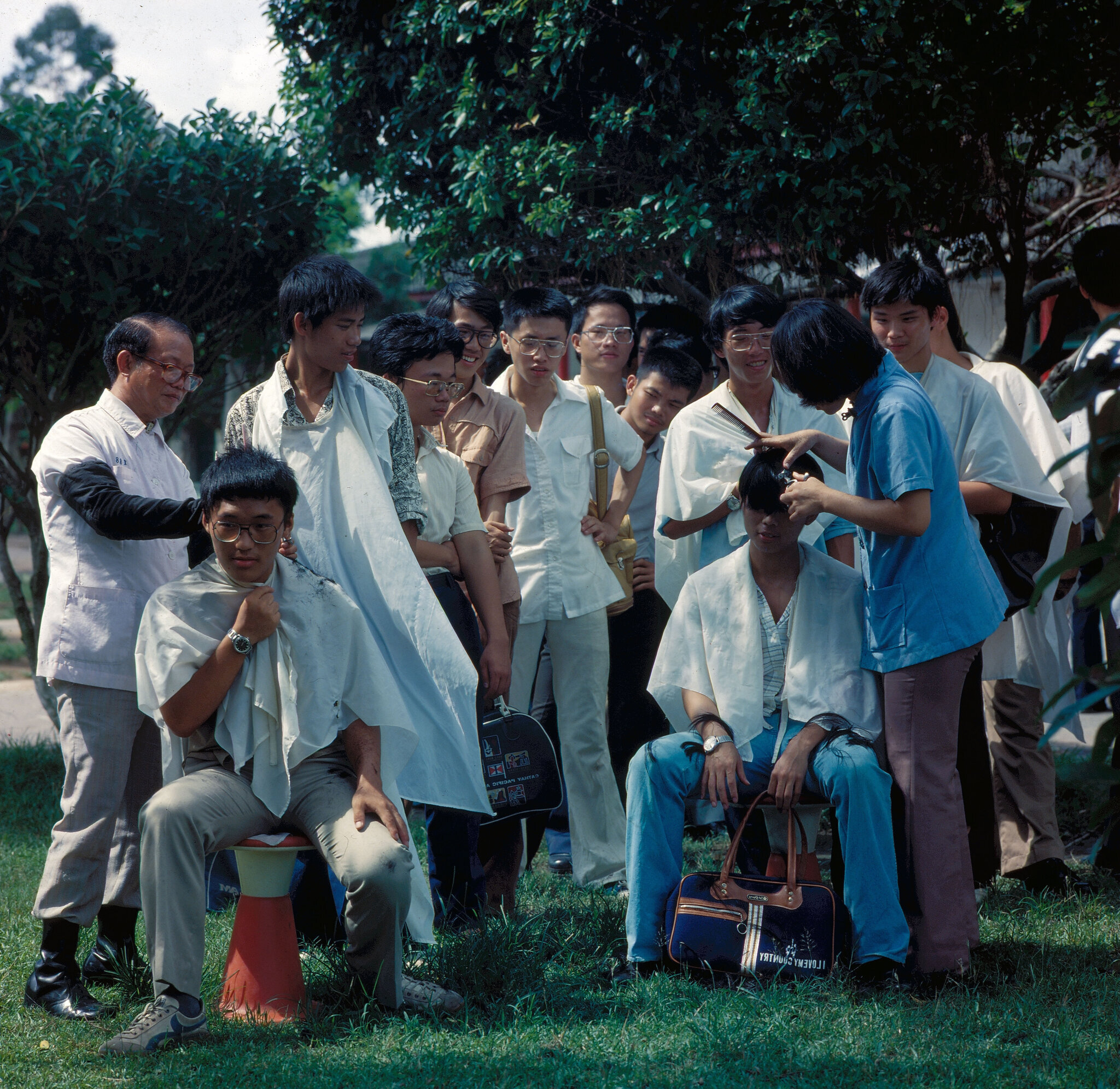 理髮大會是個「驚心動魄」的場面。每個人脖子上圍一條白圍巾,依次排隊等候「剃渡」。理髮師傅的速度真是驚人,他的電動剃刀不過轉了幾個來回,滿頭的黑髮,霎時就變成了一公分的小平頭,歷時僅有十秒。學生們摸著只剩一點點的髮根,看著彼此的新模樣,都不禁相顧大笑。