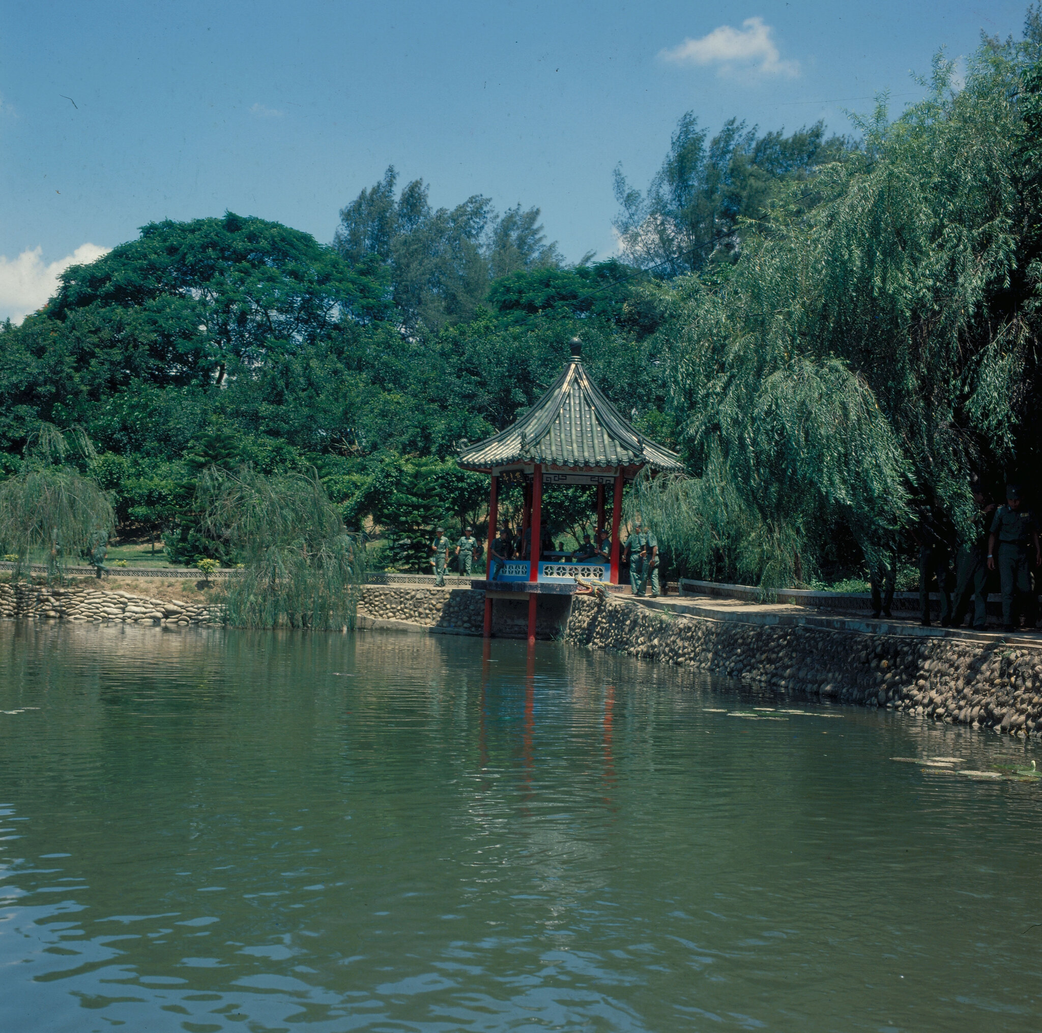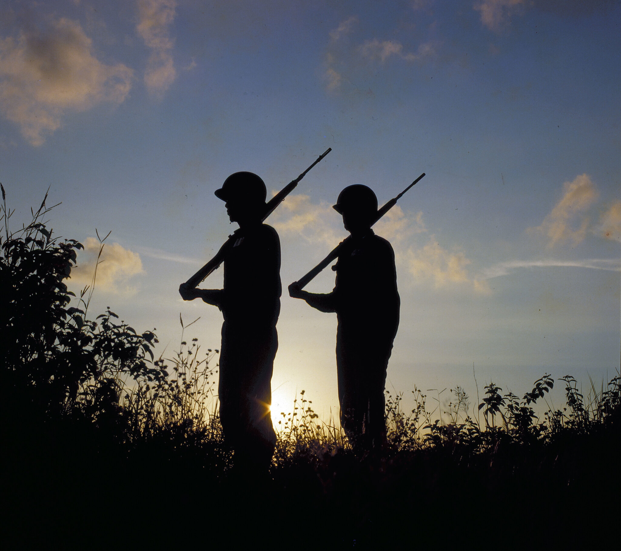 在夕陽餘暉中,持槍守衛的大專集訓學生。在嶺上長官愛的教育、鐵的訓練下,小苗逐斬茁壯為大樹。他們不再是當初的文弱書生,而蛻變為雄糾糾、氣昂昂的革命軍人了。(曉夢)