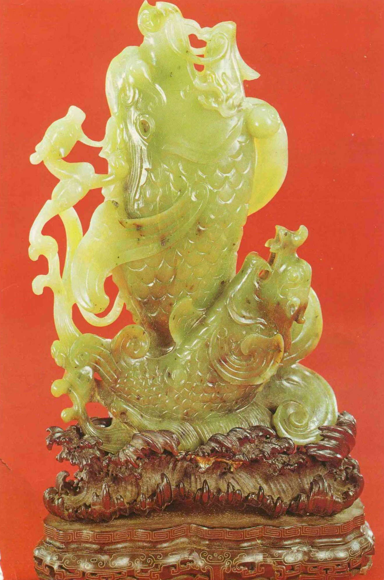 在中國的玉器中,以「鰲魚」為題的器物很多,大都雕成一尾奮力向上跳躍的魚形。由於魚在跳躍時,口一定向上張開,因此恰可做為瓶口,用來插花。
