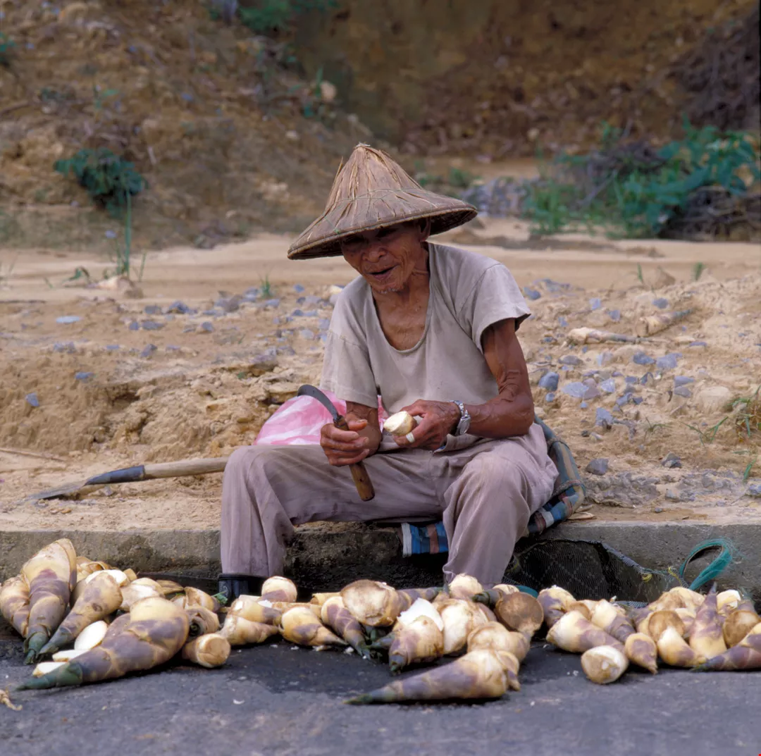 今天在往復興的路上,我們就看到一位老人坐在水溝邊削竹筍。溝水又活又清澈,他老人家用石塊把水溝當腰一攔,造了一個小水池;一顆顆剛掘起、整個兒還沾著泥的胖竹筍,就在裏面浮浮沈沈。老人手持鐮刀,替剛洗過澡的筍子去籜,一刀下去、腕一旋,白晰的筍肉應聲而去。那聲音、那畫面,絕對不比任何藝術家創作的田園組曲遜色。