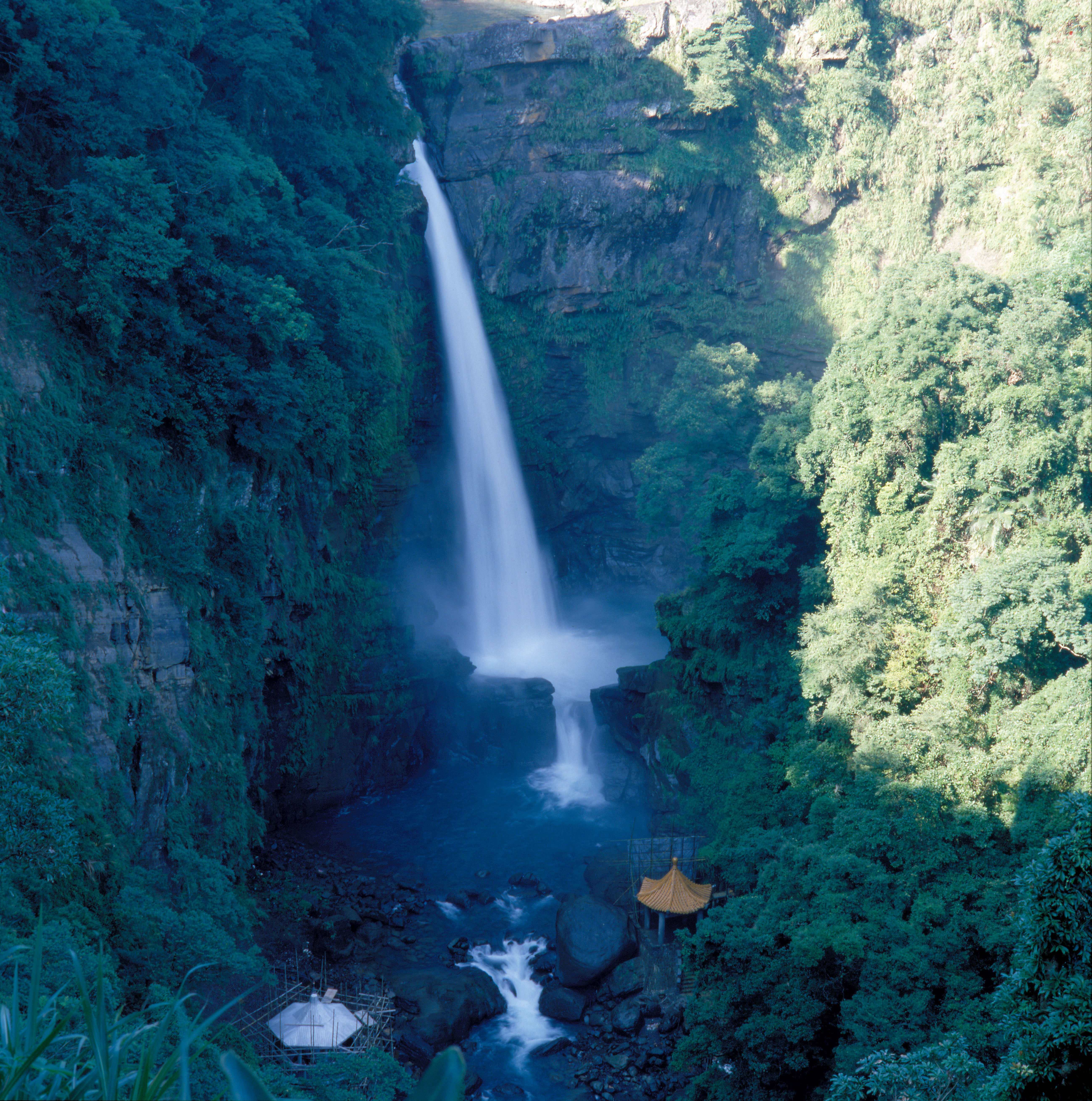 小烏來瀑布水量豐沛,漫天水絲挾轟隆之聲傾瀉而下,瀑布有二層,是宇內溪溪谷斷落而造成的。