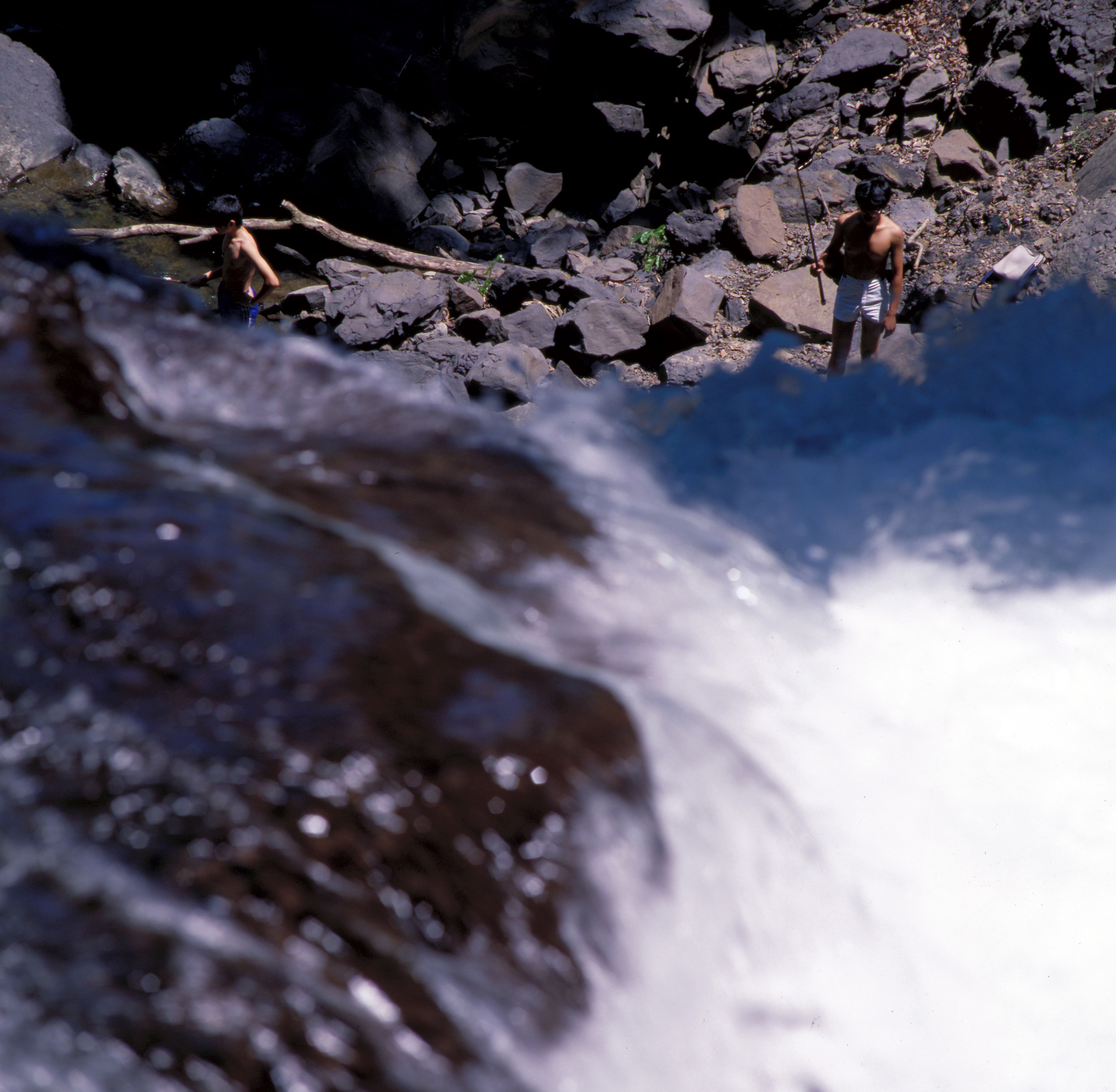 下午兩點,車至高坡橋。橋下是個小小的瀑布,有一個來自鶯歌的大家族,開了小發財、小汽車來這兒野餐。見到我們,便慇勤地請我們喝老人茶。不知是因為茶葉好,還是泉水甜,泡出來的茶真香。