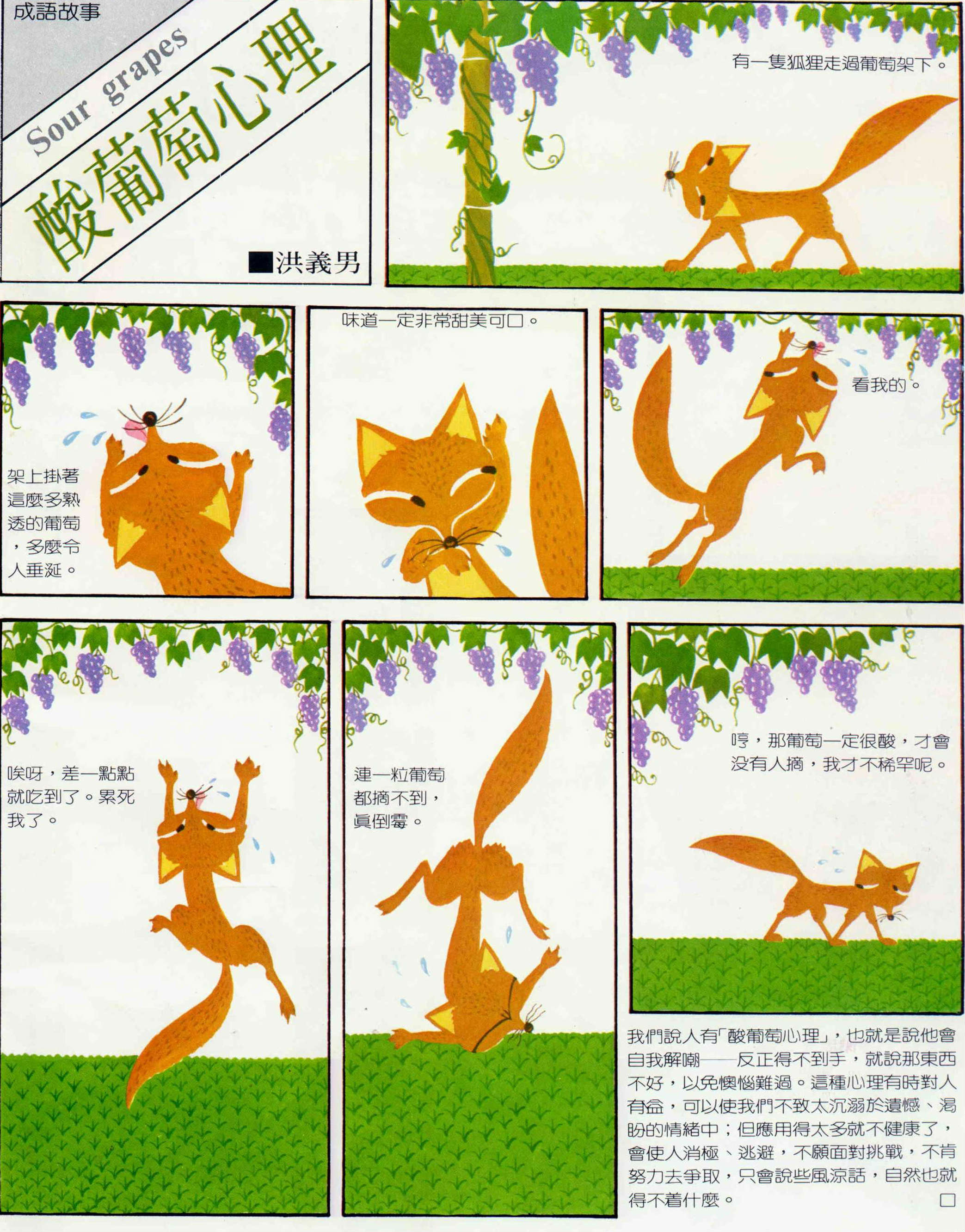 酸葡萄心理 文‧圖.洪義男 圖‧洪義男 1983 10月 EN 分享: 酸葡萄心理 洪義男有一隻狐狸走過葡萄架下。架上掛著這麼多熟透的葡萄,多麼令人垂涎。味道一定非常甜美可口。看我的。唉呀,差一點點就吃到了。累死我了。連一粒葡萄都摘不到,真倒霉。哼,那葡萄一定很酸,才會沒有人摘,我才不稀罕呢。 我們說人有「酸葡萄心理」,也就是說他會自我解嘲——反正得不到手,就說那東西不好,以免懊惱難過。這種心理有時對人有益,可以使我們不致太沉溺於遺憾、渴盼的情緒中;但應用得太多就不健康了,會使人消極、逃避,不願面對挑戰,不肯努力去爭取,只會說些風涼話,自然也就得不著什麼。 有一隻狐狸走過葡萄架下。 架上掛著這麼多熟透的葡萄,多麼令人垂涎。 味道一定非常甜美可口。 看我的。 唉呀,差一點點就吃到了。累死我了。 連一粒葡萄都摘不到,真倒霉。 哼,那葡萄一定很酸,才會沒有人摘,我才不稀罕呢。 我們說人有「酸葡萄心理」,也就是說他會自我解嘲——反正得不到手,就說那東西不好,以免懊惱難過。這種心理有時對人有益,可以使我們不致太沉溺於遺憾、渴盼的情緒中;但應用得太多就不健康了,會使人消極、逃避,不願面對挑戰,不肯努力去爭取,只會說些風涼話,自然也就得不著什麼。 分享: