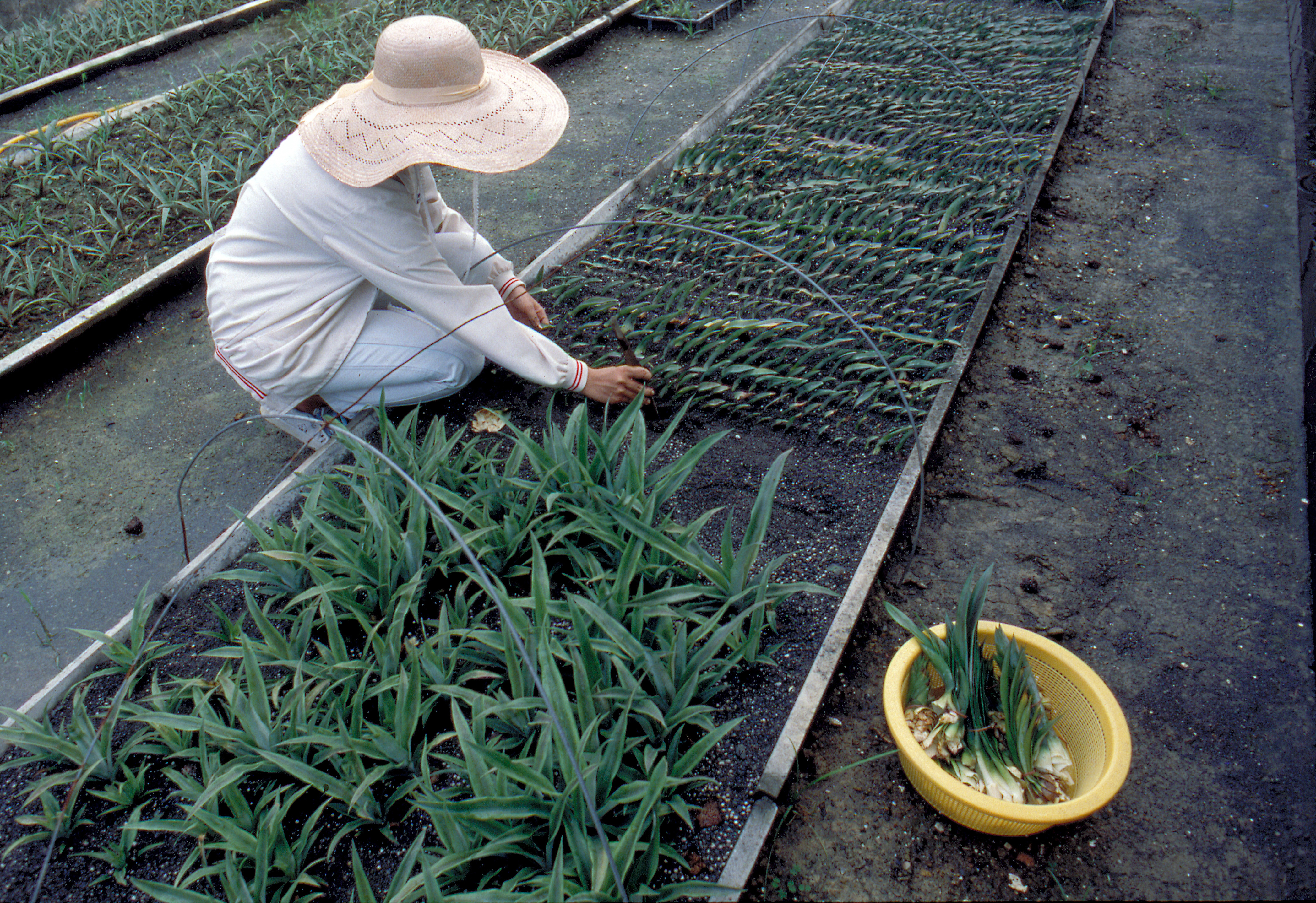 自然生長的鳳梨不結籽,鳳山分所工作人員以人工採芽培植樹苗做育種。